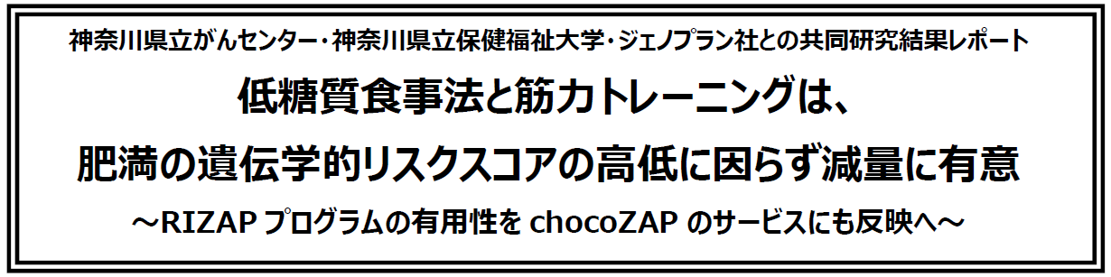 RIZAPグループ株式会社(代表取締役社長 瀬戸 健、本社:東京都新宿区、以下「RIZAPグループ」)の連結子会社であるRIZAP株式会社(以下、「RIZAP」)は、神奈川県立がんセンター(住所:神奈川県横浜市)、神奈川県立保健福祉大学(住所:神奈川県横須賀市)およびジェノプランジャパン株式会社(本社:福岡県福岡市、代表取締役:孟昇湧)は2021年4月より、4者共同で、「肥満の遺伝学的リスクスコアと食事・運動介入プログラムの効果に関する研究」を行ってまいりましたが、この度、RIZAPが提供する低糖質食事法とレジスタンス運動(筋力トレーニング)※1のプログラムが、肥満関連遺伝学的リスクスコアの高低に因らず減量に有意であるという結果を得ることができましたのでご報告いたします。