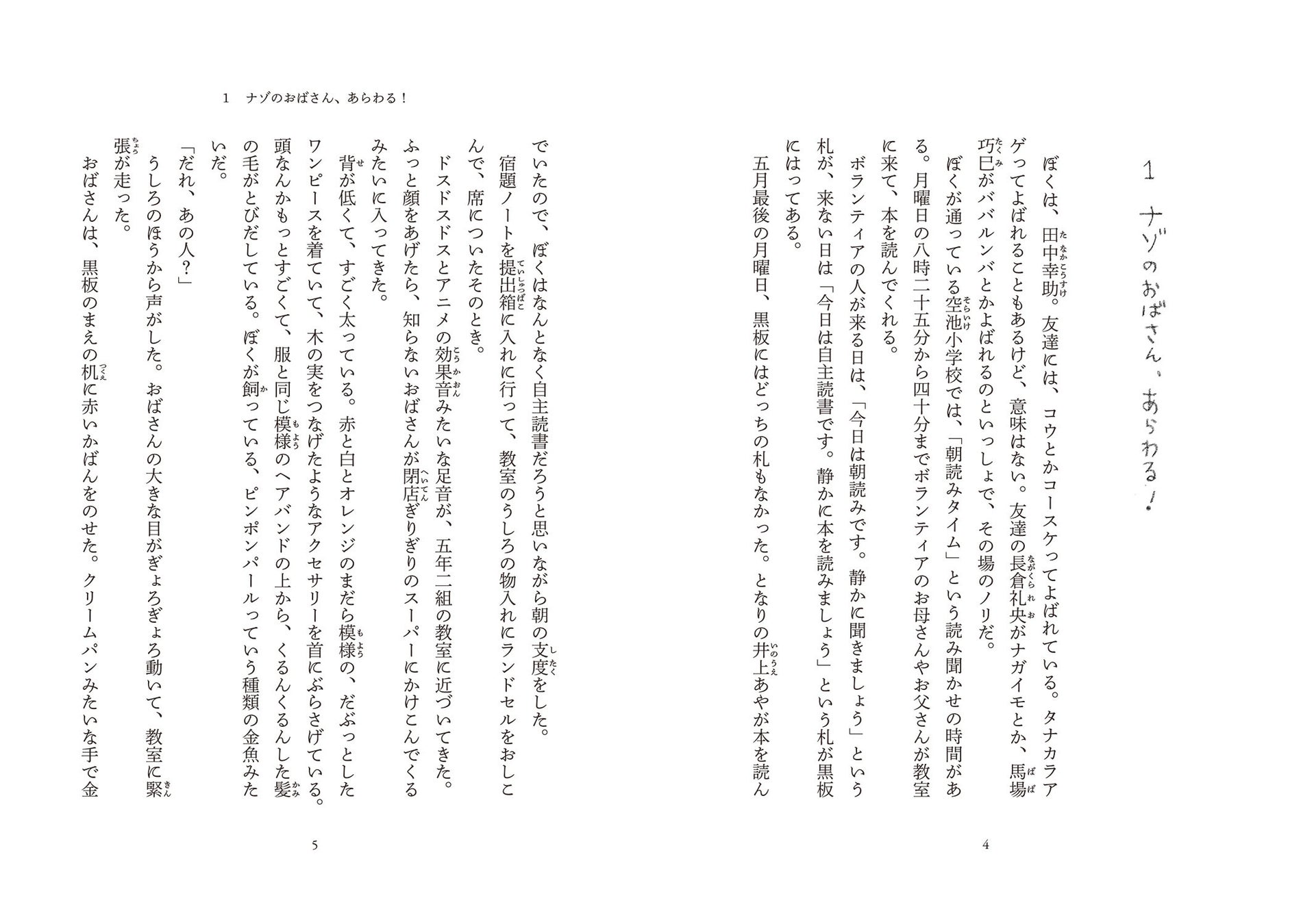 ある朝、5年2組の読み聞かせにやって 来た強烈な個性のおばさんは、誰の保護者なのかも わからない謎の存在だ。コースケたち新聞部のメン バーでおばさんにインタビューをすると、知らない うちに自分たちのせいで事件が起きていたことがわ かる……。そこには保護者による〈読み聞かせ〉 と、各自の〈自主読書〉のどちらが良いか?という 問題も横たわっていた。クラス全員でアンケートを とると、皆の考えもバラバラ。皆にとって良い 「解」なんてあるのだろうか? そこから子ども達 の中に様々な気づきが展開していきます。