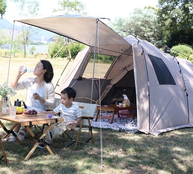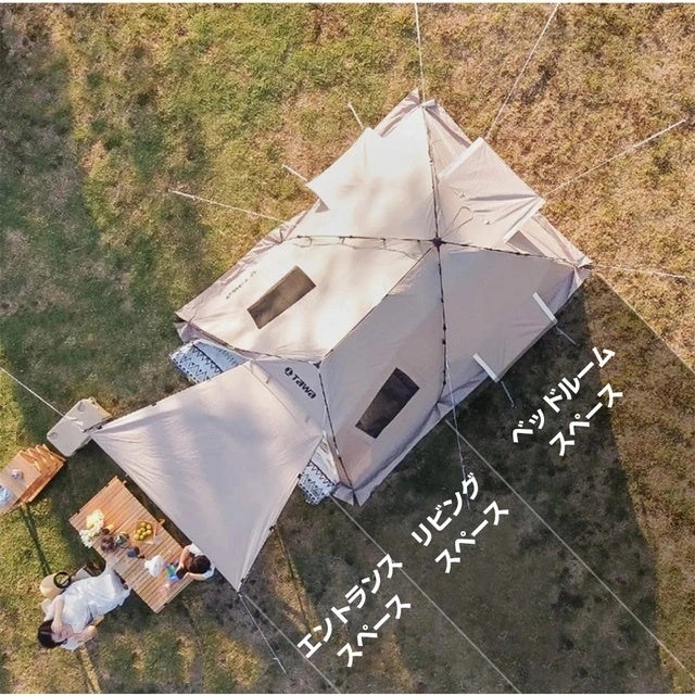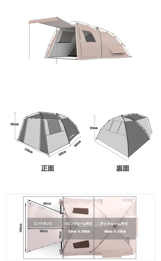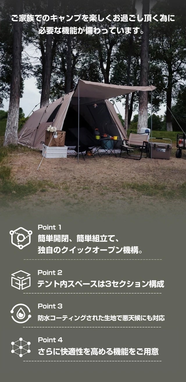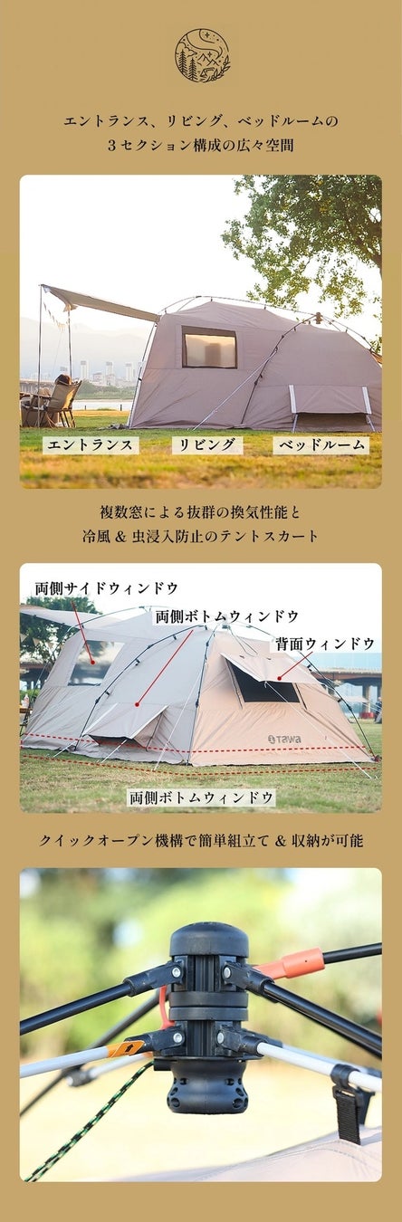 大きなテントの設置は面倒だと感じている方に朗報!クイックオープン機構で超簡単組立て&収納できるテントが完成!エントランス、リビング、ベッドルームの3セクション構成でゆとりある空間に家族と過ごせます!耐水性生地使用、複数窓で通気性抜群、全周スカートで冷風対策、メッシュ素材のインナーテントで快適です。