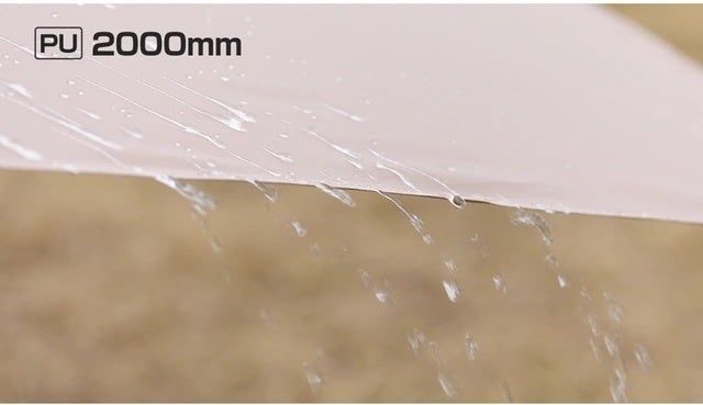 テントの使用生地は、PU2000mm防水コーティングが施されたオックスフォード生地を使用しているので、急な雨にも対応可能です。