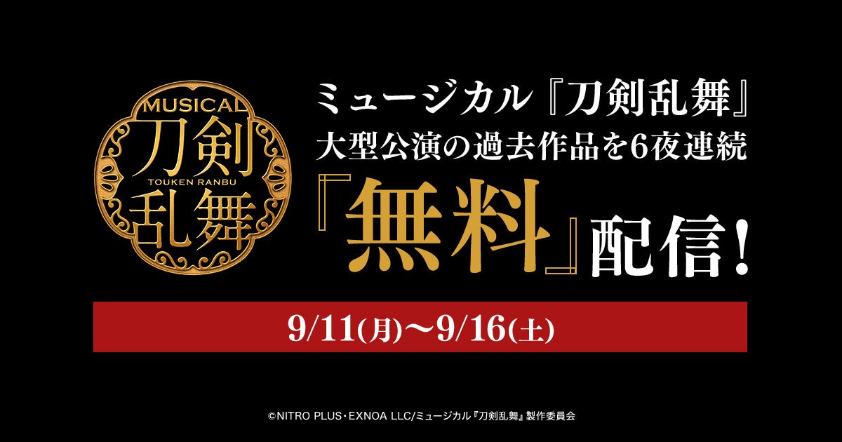 また、ミュージカル『刀剣乱舞』シリーズより大型公演の過去作品を9月11日(月)〜9月16日(土)までの6夜連続で無料配信いたします。是非お見逃しなく!