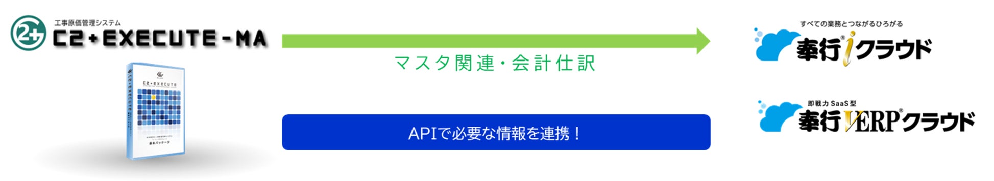 工事原価管理システム「C2+EXECUTE-MA」は、勘定奉行iクラウド/勘定奉行V ERPクラウドとのAPI連携が可能となり、建設業界におけるリアルタイム原価管理、戦略的な経営判断が可能になります。