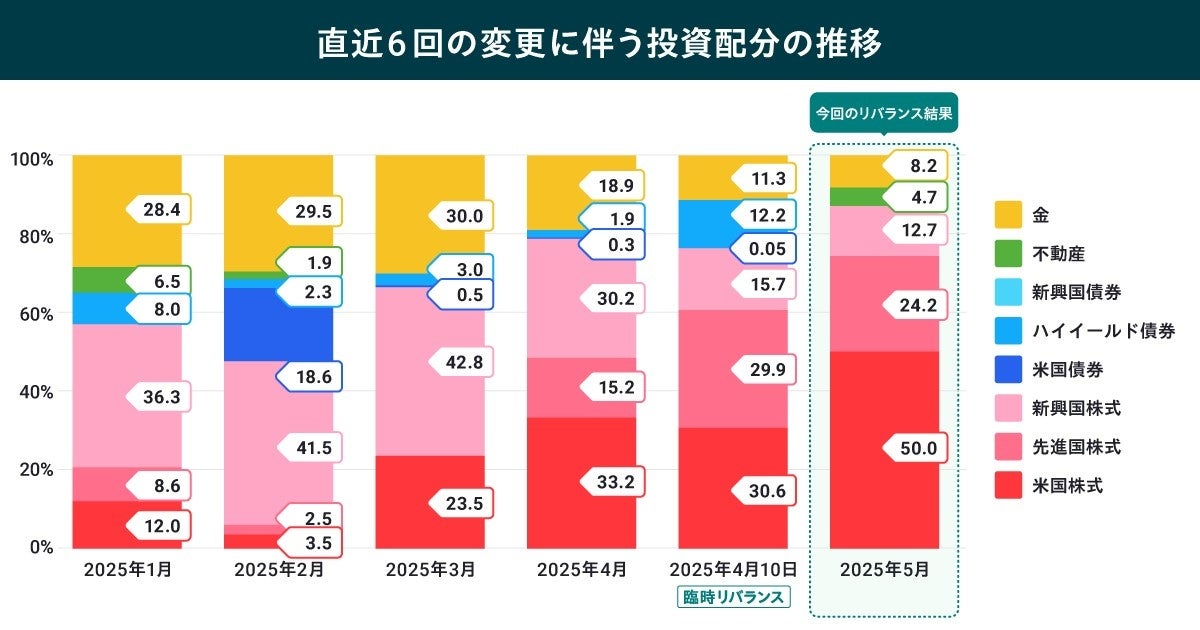 ※上記投資配分について、2025年1月は2024年12月27日、2025年2月は1月29日、2025年3月は3月3日、2025年4月は3月28日、2025年5月は4月30日のそれぞれの変更時点の比率を示しています。2025年4月は、通常の変更に加えて4月10日に臨時リバランスを実施しました。