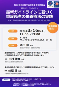 ネスレ日本株式会社 ネスレ ヘルスサイエンス カンパニー(本社:兵庫県神戸市、カンパニープレジデント:中島昭広、以下「ネスレ ヘルスサイエンス」)は、2024年3月14日-16日に北海道内6か所で、約7200名の参加者と共に開催された『第51回日本集中治療医学会学術集会(JSICM)※1』(会長:札幌医科大学医学部集中治療医学 升田好樹先生)にて、「最新ガイドラインに基づく重症患者の栄養療法の実践」をテーマに、教育セミナーを3月16日(土)に共催しました。