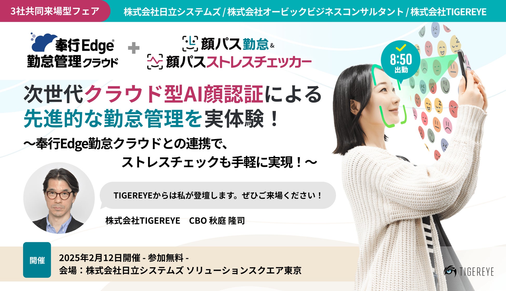 株式会社TIGEREYE(本社:東京都中央区、代表取締役:上村学、以下「TIGEREYE」)は、株式会社日立システムズ(本社:東京都品川区、代表取締役 取締役社長柴原 節男、以下日立システムズ)主催にて、株式会社オービックビジネスコンサルタント(本社:東京都新宿区、代表取締役社長和田成史、以下OBC)との3社共同で、TIGEREYEが開発した顔パス勤怠とOBC社の「奉行Edge勤怠管理クラウド」とのデータ連携を体験できる来場型フェアを開催します。