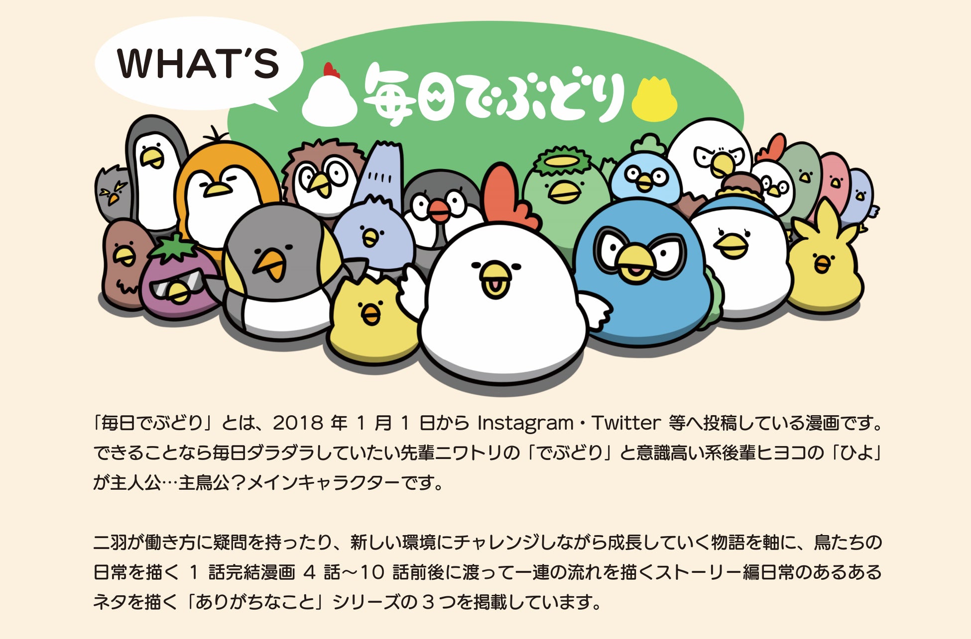 漫画家・橋本ナオキによるインスタグラムなどのSNSで人気の昼まで寝ていたいニワトリと意識高い系後輩ヒヨコや様々なキャラを持った鳥たちが会社員生活を送る様子を描く漫画「毎日でぶどり」。当イベントとのコラボ漫画「キャンピングカーでありがちなこと」のパネル展示、ジャパンキャンピングカーショーとのタイアップ特別描きおろしイラストの展示、グッズ販売を実施します!