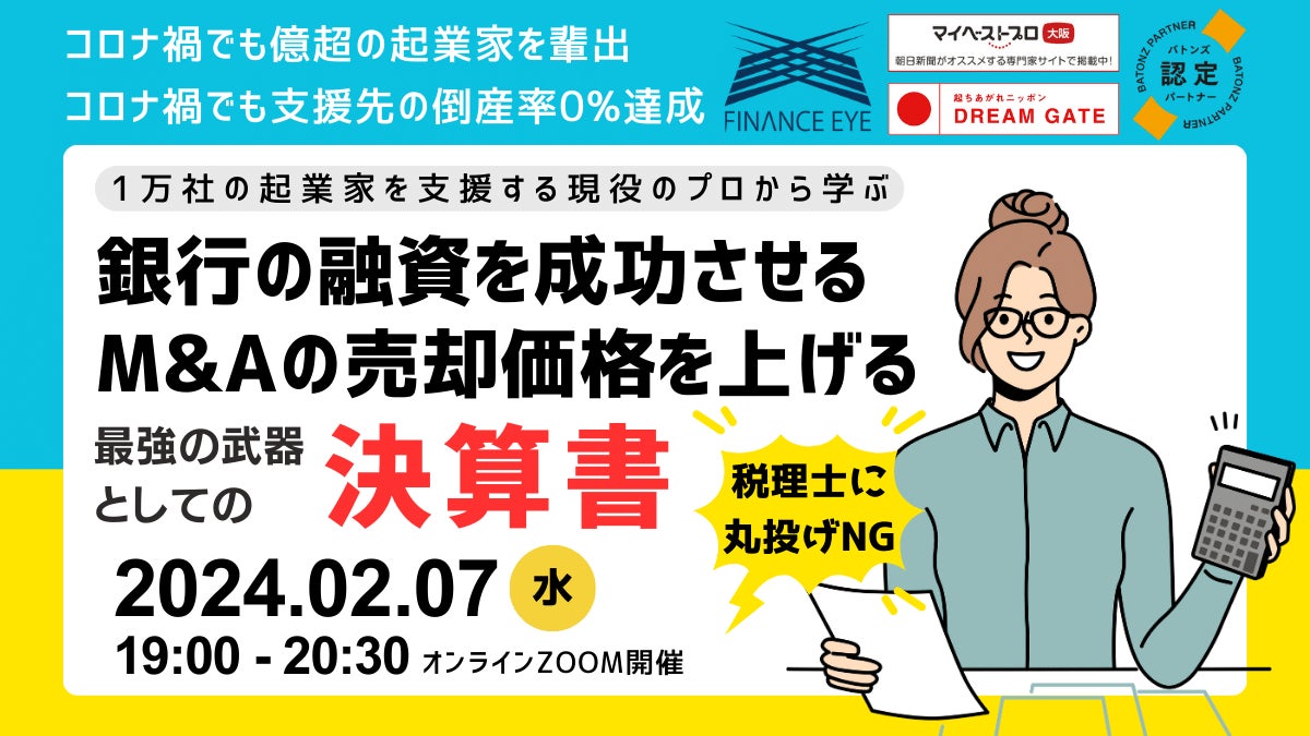 株式会社ファイナンスアイ(本店:大阪府大阪市、代表取締役:田中 琢郎。以下、ファイナンスアイ)は起業家・経営者・個人事業主向けに【創業融資からM&A資金まで金融機関(日本政策金融公庫・信用保証協会・信用金庫・銀行など)の融資(デット・ファイナンス、ベンチャーデット)で資金調達を成功させる新融資戦略】を開催します。1万社の起業家や経営者を支援し、コロナ禍でも支援先の倒産率は0%を達成し、コロナ禍でも億超の起業家を創出し続けたファイナンスアイが伝えます。開催日時は2024年2月17日(土)16:00にウェビナー形式で開催します。皆さまもご存じの通り、金融機関は困ってからでは融資をしてくれません。彼らにも彼らのルールや審査基準があります。最初から融資(デット・ファイナンス)に戦略をもっておけば、アナタのビジネスはファイナンスの力を得て、成功へと躍進することでしょう。