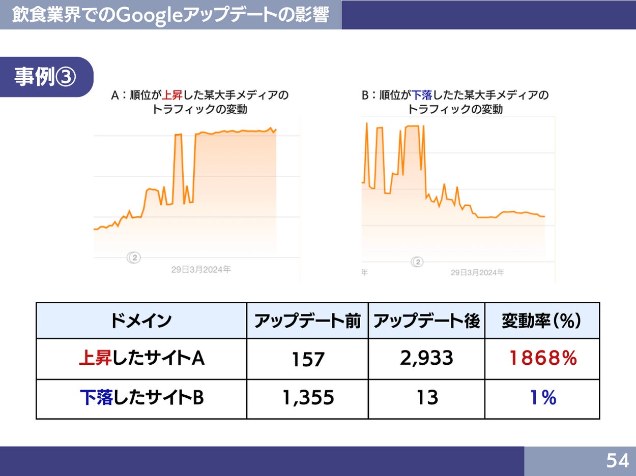 2024年4月に完了したGoogleアップデートにより飲食業界の各サイトのトラフィックに変動が起きています。今回のアップデートでは、以下の内容を反映しているサイトがポジティブな影響を受けています。