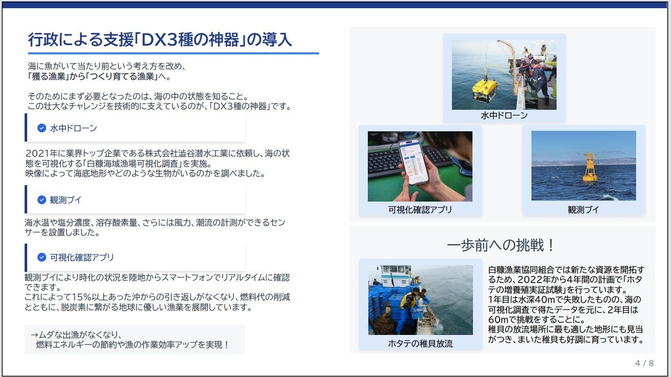 現在、町役場と協力し、水中ドローンや観測ブイを活用した漁業のデジタル化(DX)を推進。その結果をふまえホタテの養殖も始まりました。
