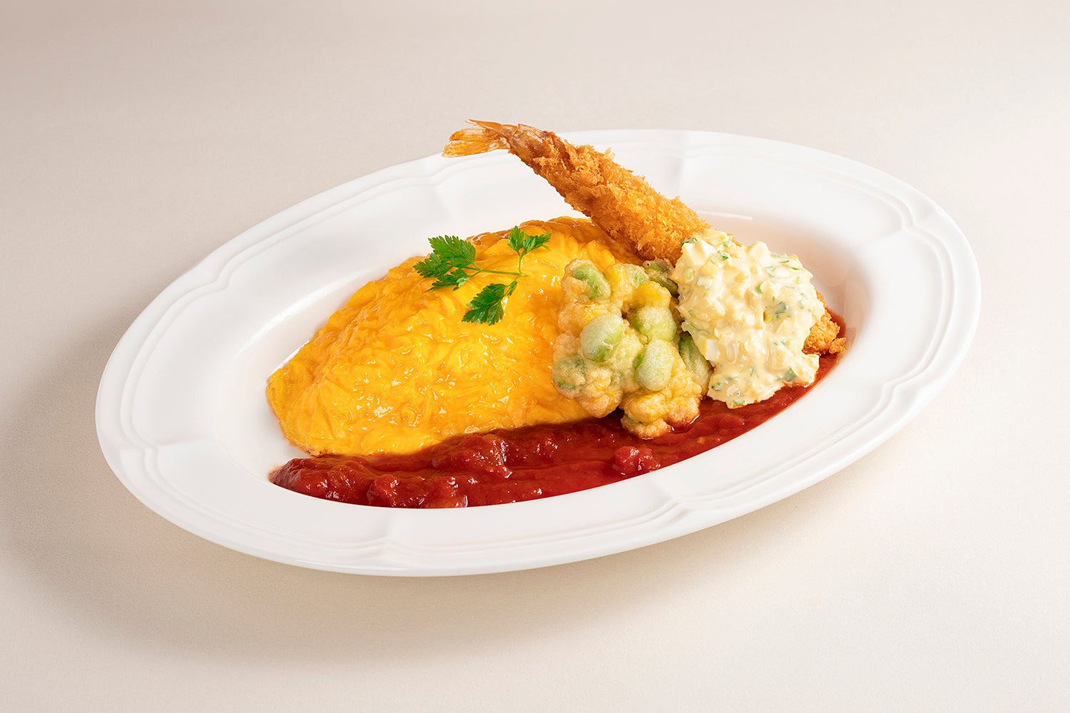 ◆枝豆フリッターと海老フライのトマトソースオムライス