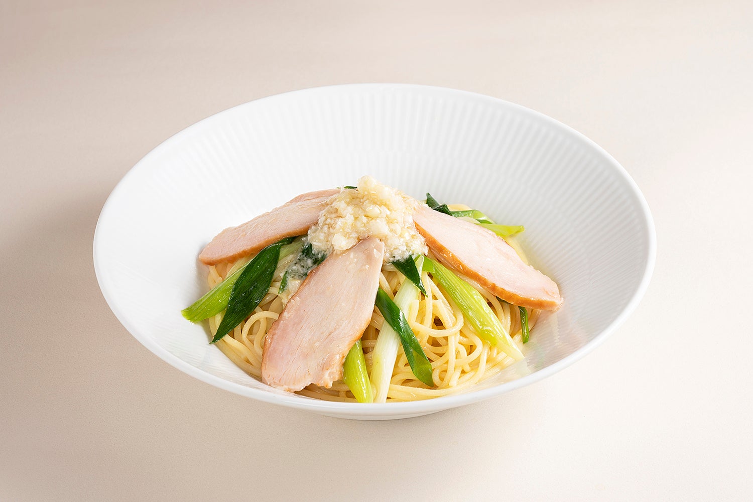 青と白2種類のねぎをたっぷりと使用し、シャキシャキとした食感が楽しめるパスタ。
