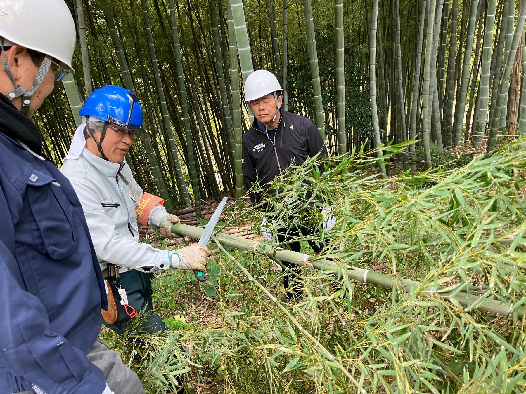 今回の活動では川崎市役所、公園緑地協会、当社あわせて約20名が参加し、公園緑地協会の里山レンジャーの指導のもと、春先に繁殖し本来の生育地域から範囲を広げた若竹を中心に約30本の竹の伐採を実施しました。