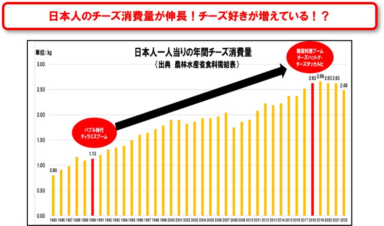 日本のチーズ消費量は1990年~2018年の約30年で2.3倍以上に伸長しており、チーズ好きが増えていると考えられます。また、近年の韓国料理ブームでチーズをふんだんに使ったメニューが若年層を中心に大ヒットしたことで、韓国料理以外でもチーズ特盛メニューが拡大しています。