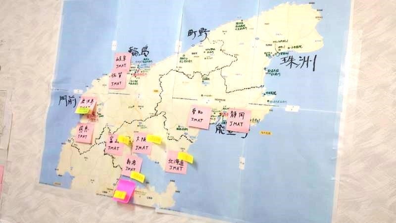 穴水の支部ではJMATの他にDMAT(災害派遣医療チーム)、DHEAT(災害時健康危機管理支援チーム)、DPAT(災害派遣精神医療チーム)、薬剤師会、ロジスティックスなどが同じ部屋で活動していました。