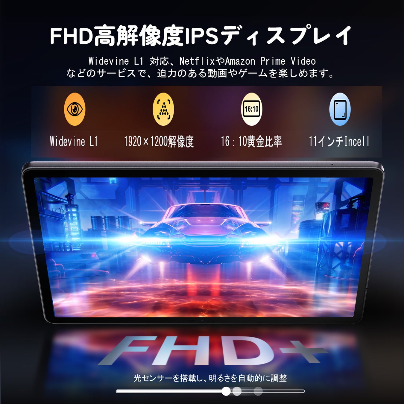 【𝐖𝐢𝐝𝐞𝐯𝐢𝐧𝐞 𝐋𝟏+光センサ+ジャイロセンサ】1920*1200 FHDディスプレイ、光センサー搭載且つWidevine L1対応で、NetflixやAmazon Prime ビデオなどでの動画鑑賞に高画質で楽しめる11インチタブレットです。さらに、高感度の6軸ジャイロセンサーはタブレットの傾きや動きを感知できるため、視点移動や傾け操作などが簡単になる上に、ゲームのエンタメも迫力たっぷりに楽しめます。