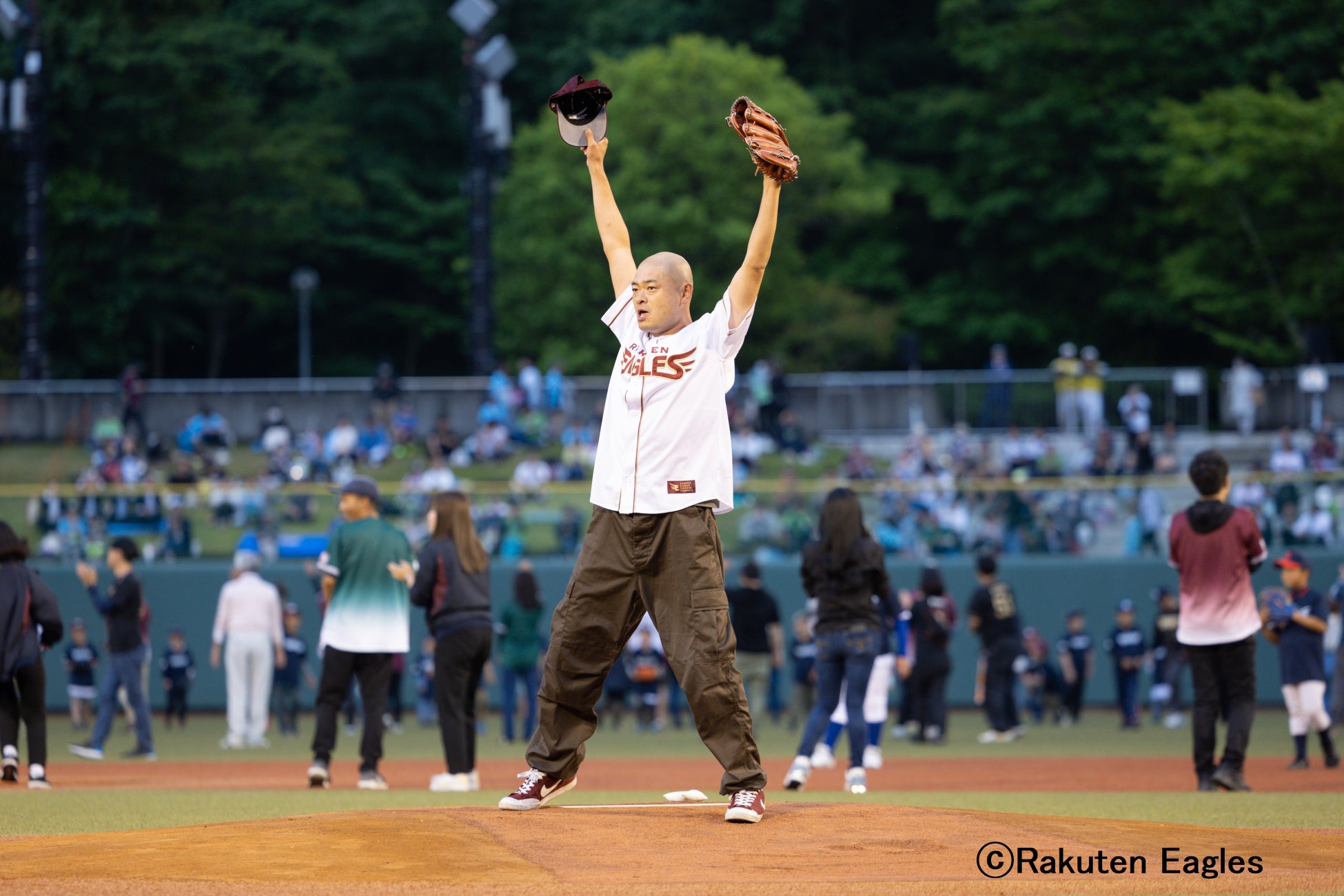 ●セレモニアルピッチ 福島県出身のあばれる君が小学1~6年までの児童、保護者108組216名と一緒にグラウンドに登場!あばれる君は事前のピッチング練習で80球以上を投げてピッチングに挑み、捕手を務めた楽天イーグルス、銀次アンバサダーに向かって見事なストライク投球を披露しました。
