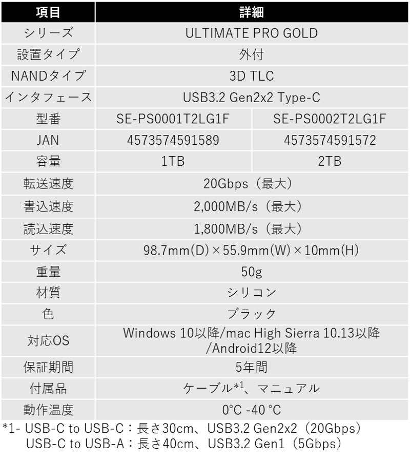 株式会社旭東エレクトロニクス(本社:東京都港区、代表取締役社長:孫旭利)は、2024年3月上旬よりUSB 3.2 Gen2x2(20Gbps)対応ポータブルSSD製品であるULTIMATE PRO GOLD Series Portable SSDの販売を順次開始いたします。