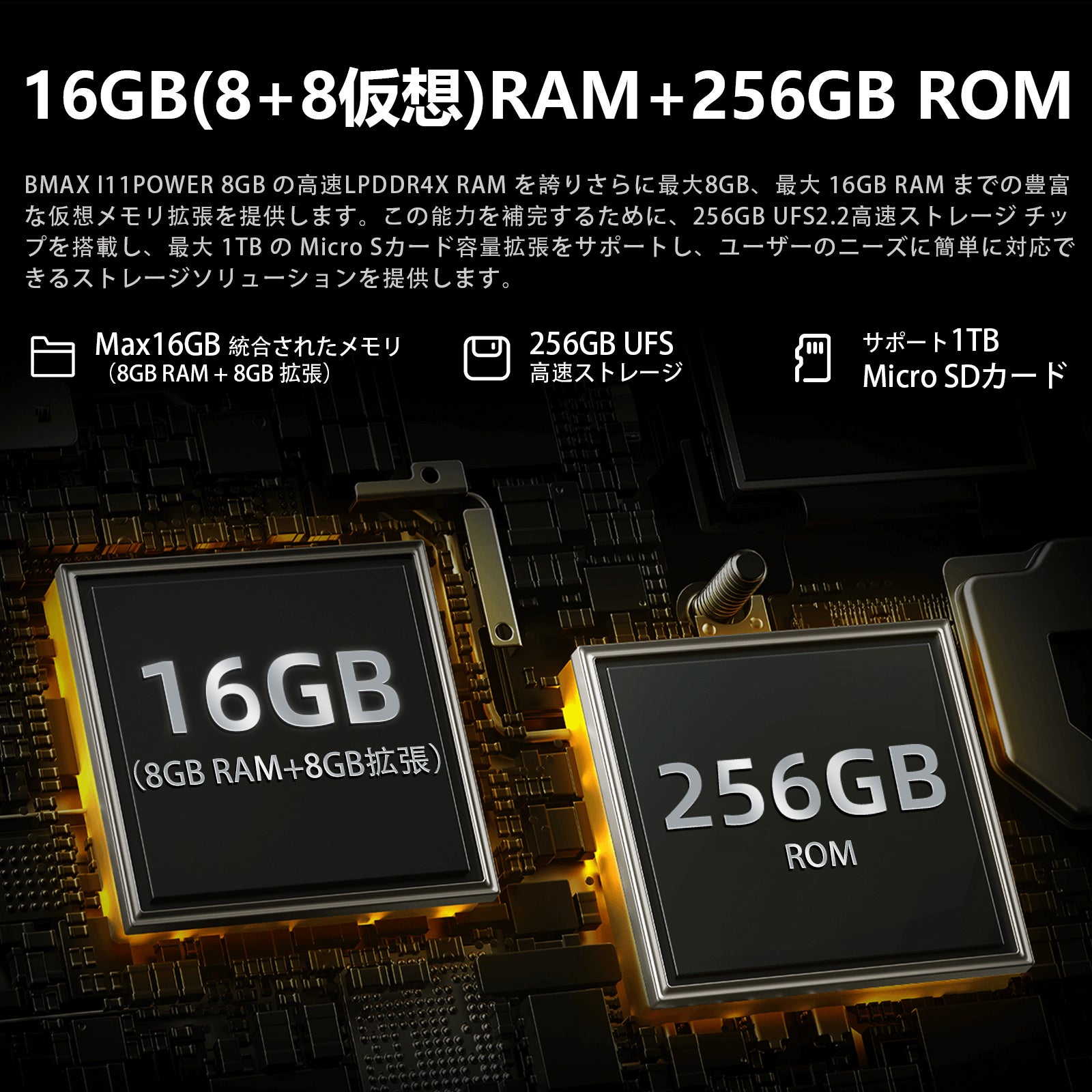 I11POWERは 16GB RAM(8GBのRAMに加え8GBの拡張メモリー)、アプリケーションを素早く起動し、マルチタスクのウィンドウを非常にスムーズに処理することができます。256GBのストレージで、写真、ドキュメントをさらに保存できます。また、マイクロSDカードスロットはストレージを最大1TBまで拡張できるため(FAT32形式、別売り)、電子書籍、ビデオ、写真など、お気に入りのすべてのメディアファイルを一緒に保存できます。