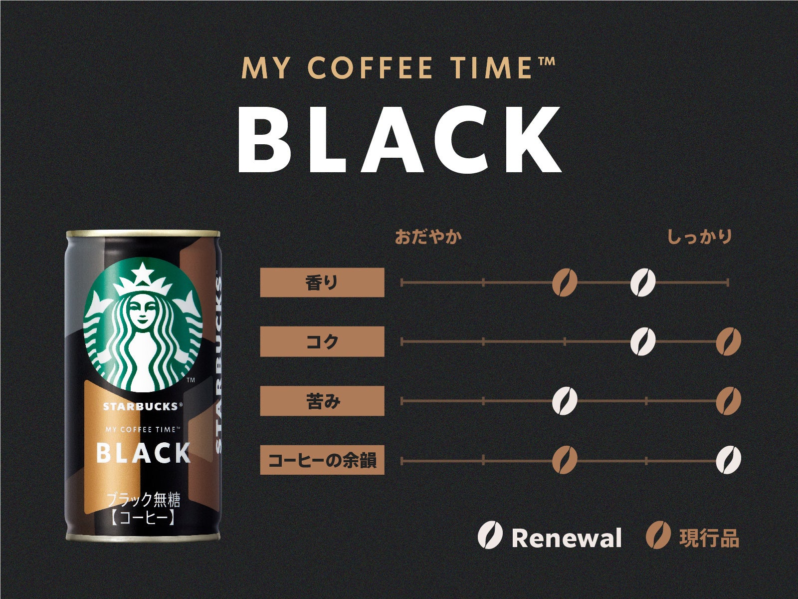 「スターバックス® MY COFFEE TIME™」は、1杯のコーヒーを通し、まるでお気に入りのカフェにいるかのような心地よい“自分時間”の演出をコンセプトとした、ショート缶コーヒーシリーズです。ご自宅やオフィスなどシーンを選ぶことなく、気軽にスターバックスの味わいをお楽しみいただけるシリーズとして、普段缶コーヒーに親しみのない方にも愛飲いただくなど、2024年の発売以来、ご好評いただいています。今回、従来以上に思い思いの“自分時間”に寄り添い心地よさを高められるよう、奥深い余韻とやさしい味わいを楽しめる商品へとリニューアルします。