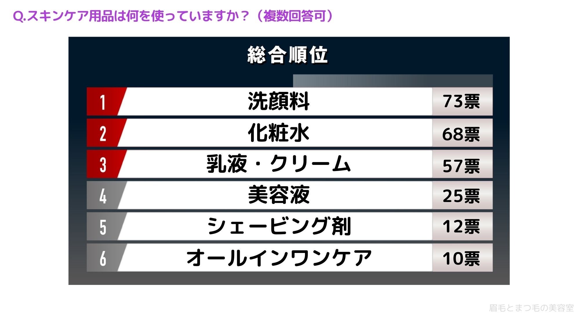 どんなスキンケアをしているのかお聞きしたところ「1位>洗顔料(73票)」、「2位>化粧水(68票)」、「3位>乳液・クリーム(57票)」、「4位>美容液(25票)」、「5位>シェービング剤(12票)」、「6位>オールインワンケア」という結果になりました。