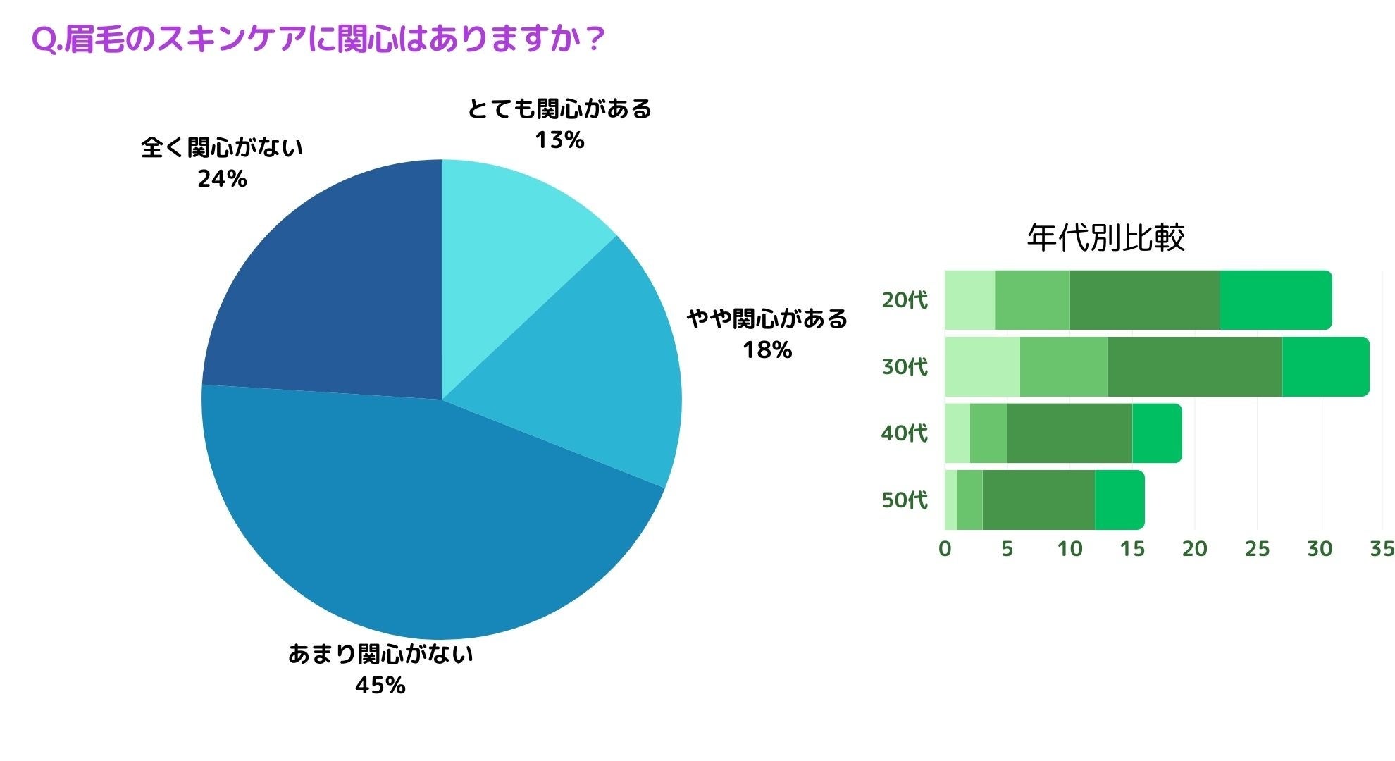 眉毛のスキンケアに関心があるかお聞きしたところ「とても関心がある(13%)」、「やや関心がある(18%)」、「あまり関心がない(45%)」、「全く関心がない(24%)」という結果になりました。