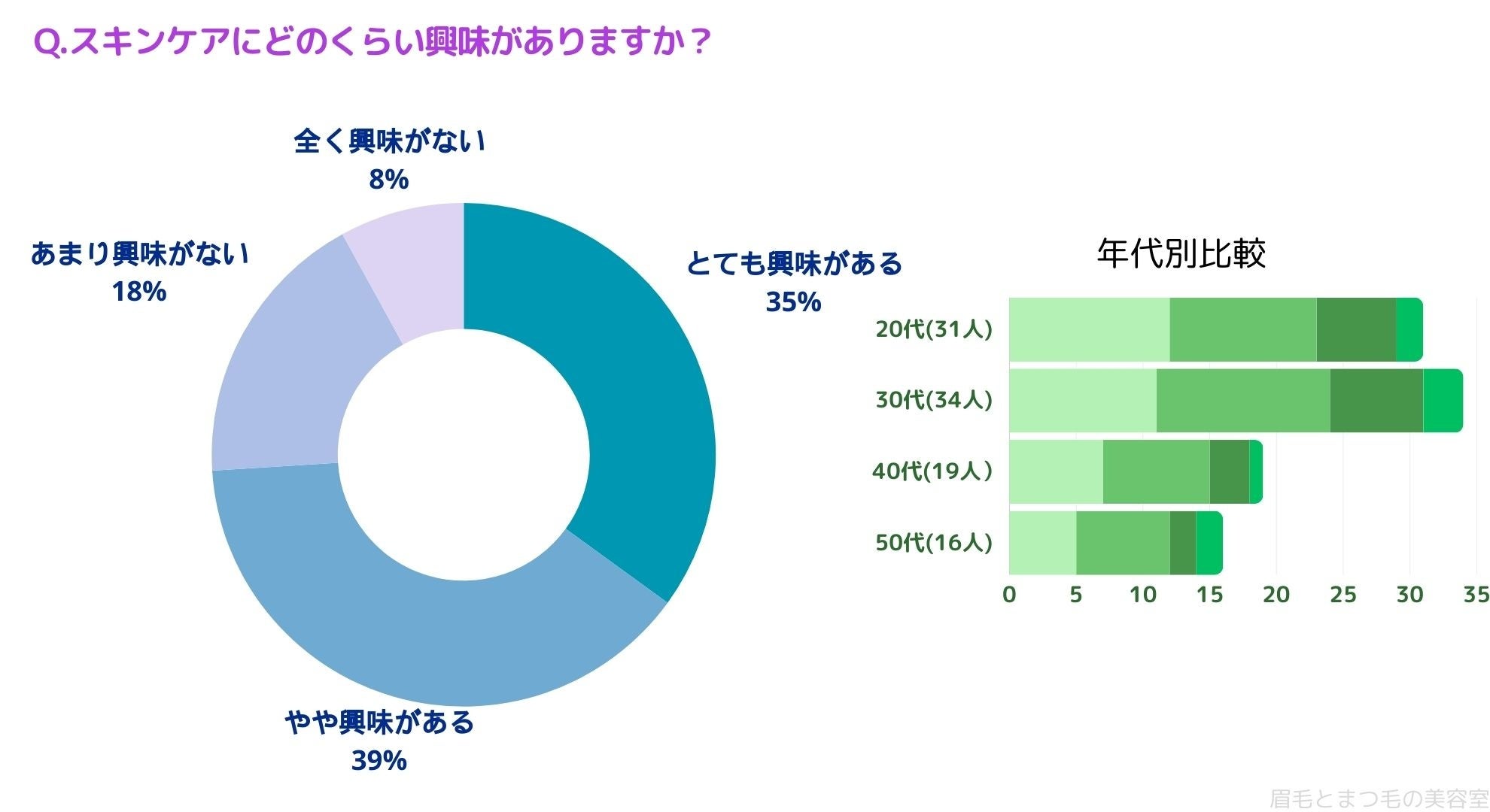 スキンケアに興味があるかお聞きしたところ「とても興味がある(35%)」、「やや興味がある(39%)」、「あまり興味はない(6票)」、「全く興味がない(2票)」という結果になりました。