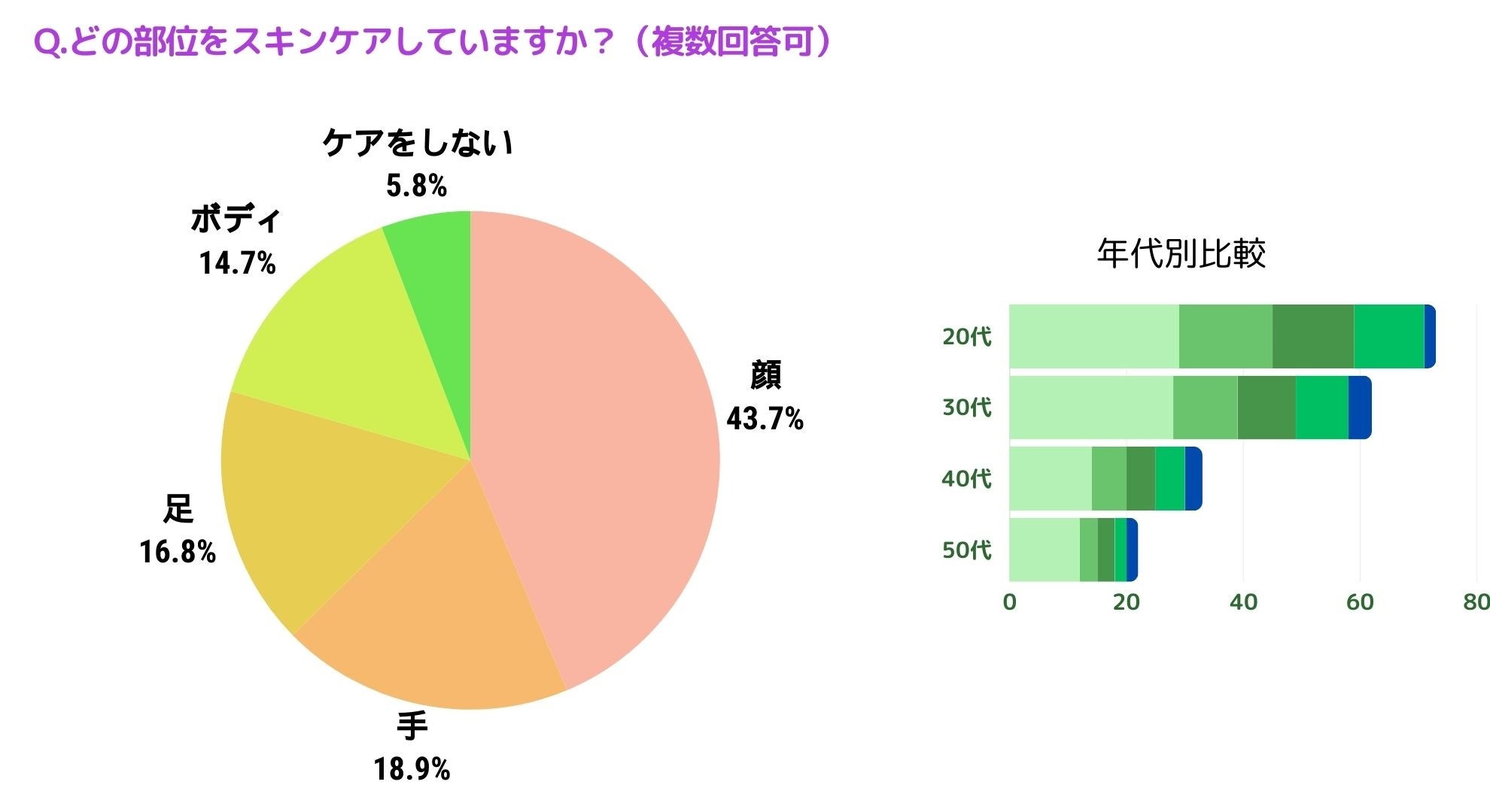 どの部位をスキンケアしているかお尋ねしたところ「顔(43.7%)」、「手(18.9%)」、「足(16.8%)」、「ボディ(14.7%)」、「ケアをしない(5.8%)」という結果になりました。