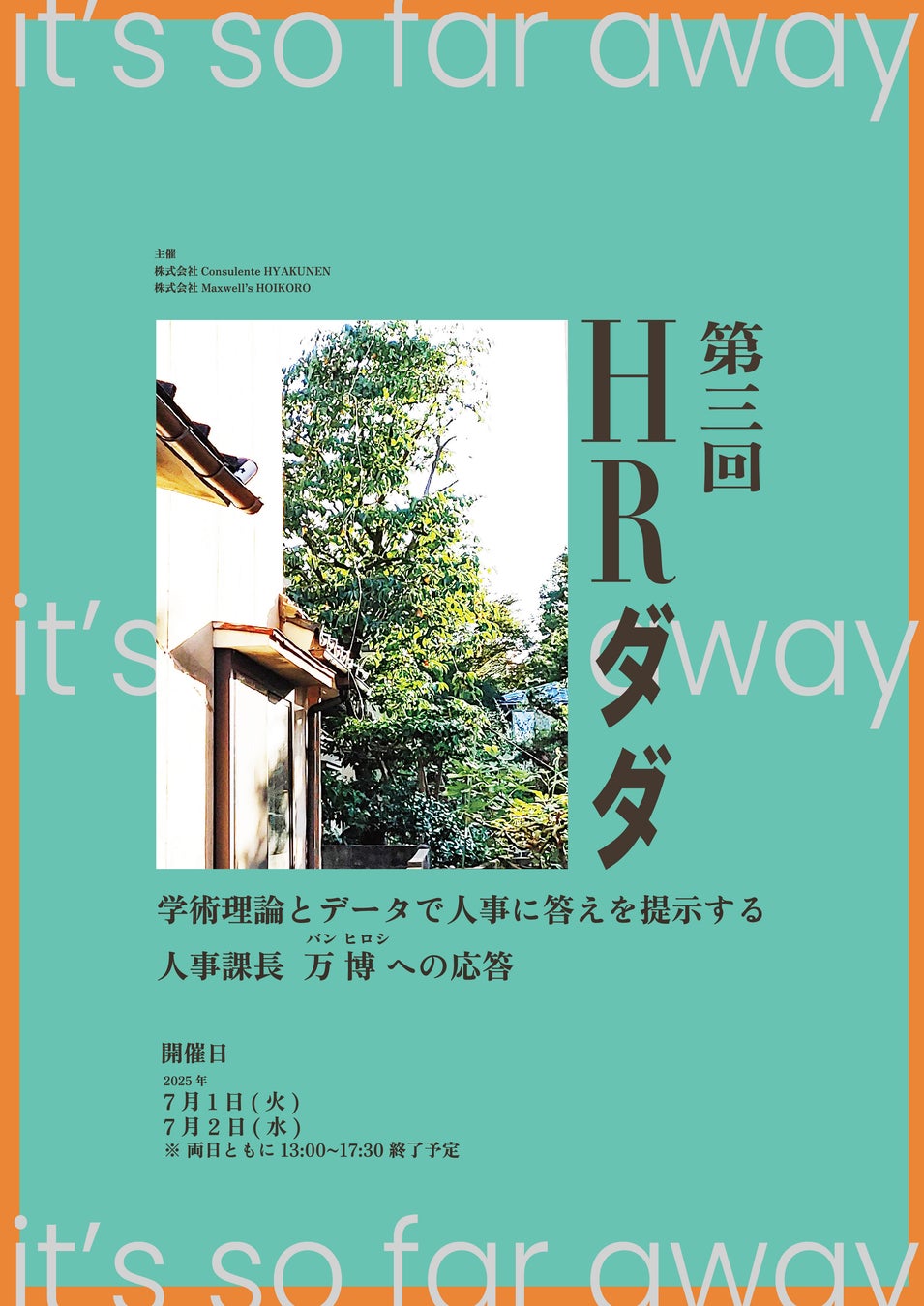 第三回HRダダは、架空の人事課長 “万 博/バン ヒロシ”が日々抱える悩みや迷いの一端を、学術理論やデータというエビデンスをもとに探究し、答えを提示するイベントです。