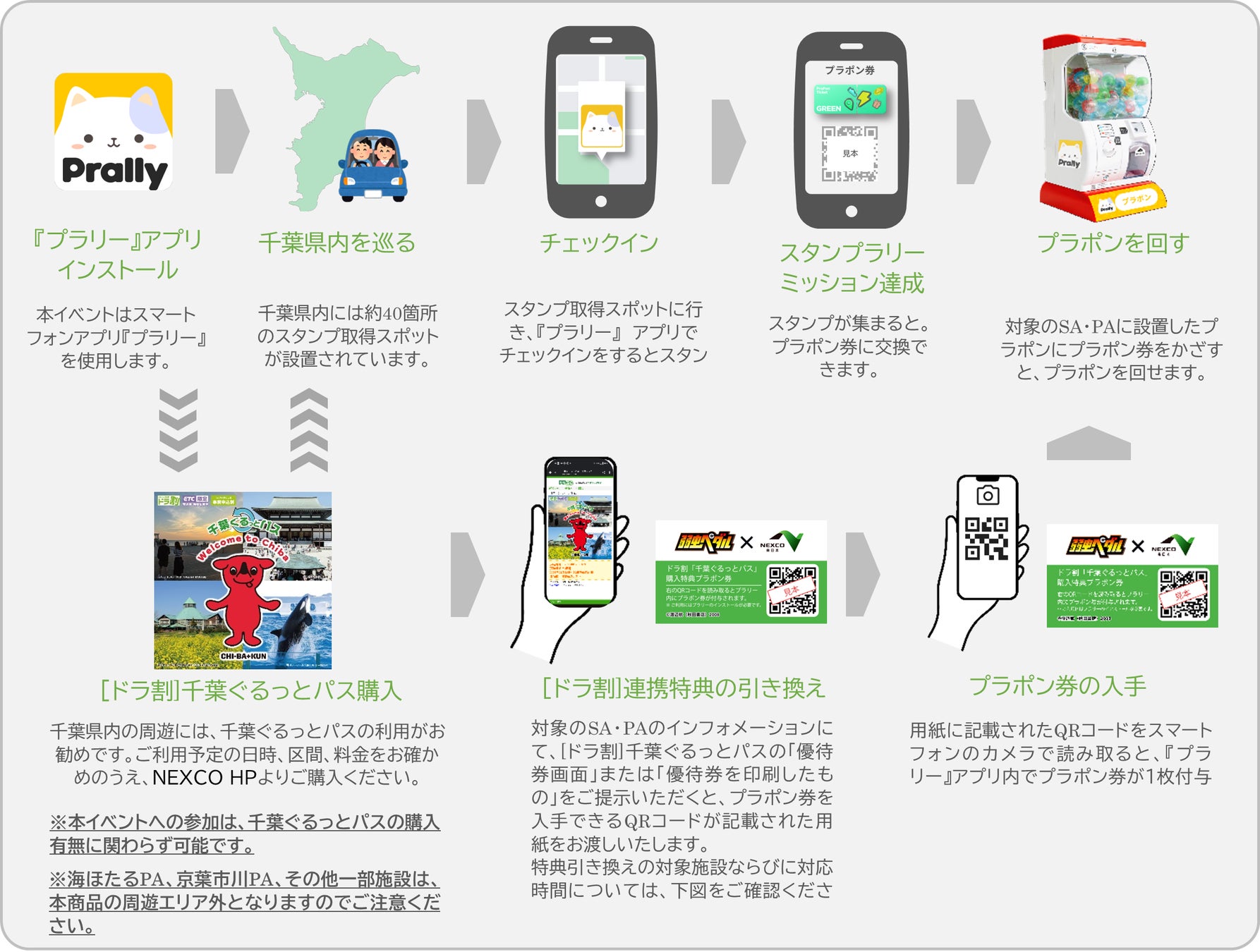 「千葉ぐるっとパス」は、ETC車限定で連続する最大2日間、千葉県内対象エリアの高速道路が定額で乗り降り自由となる[ドラ割]商品です。ご利用方法、価格、対象エリアについては専用サイト(https://www.driveplaza.com/etc/drawari/chiba/ )をご確認ください。千葉ぐるっとパスの利用期間中に本イベントに参加された方には、プラポンを追加で1回まわすことができる連携特典をご用意しています。さらにアンケート回答者の中から抽選で千葉県の名産品等が当たるキャンペーンも実施します。詳細はイベント特設サイトをご覧ください。