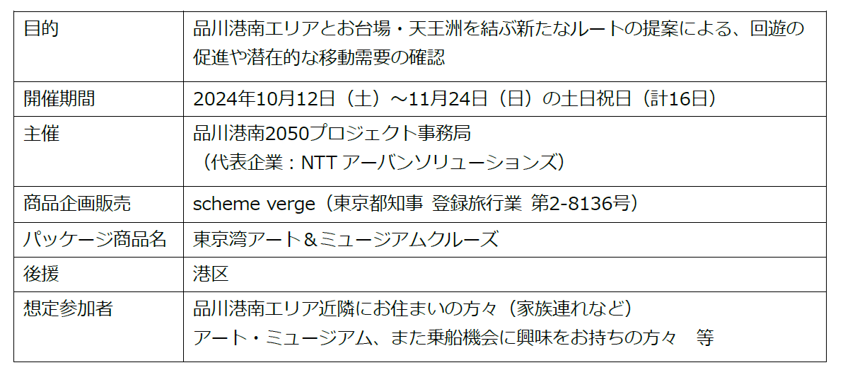 NTTアーバンソリューションズ株式会社(本社:東京都千代田区、代表取締役社長 辻󠄀上広志、以下「NTTアーバンソリューションズ」)は、scheme verge株式会社(本社:東京都文京区、代表取締役 嶂南達貴、以下「scheme verge」)と共同で、品川港南エリアの魅力や価値の最大化、地域の課題解決などをはかる「品川港南2050プロジェクト」の取り組みの一環として、品川港南エリアから近隣の天王洲・お台場エリアをめぐる舟運を利用した社会実験を、2024年10月12日(土)~11月24日(日)の土日祝日(計16日)に実施します。