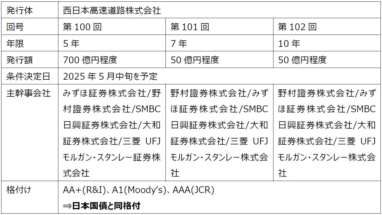 西日本高速道路は2025年度に5年・7年・10年債をソーシャルボンドとして発行します。時期は5月、7月、8月、10 月、2026年2月を基本としながら、資金需要・市場環境を踏まえて決定します。