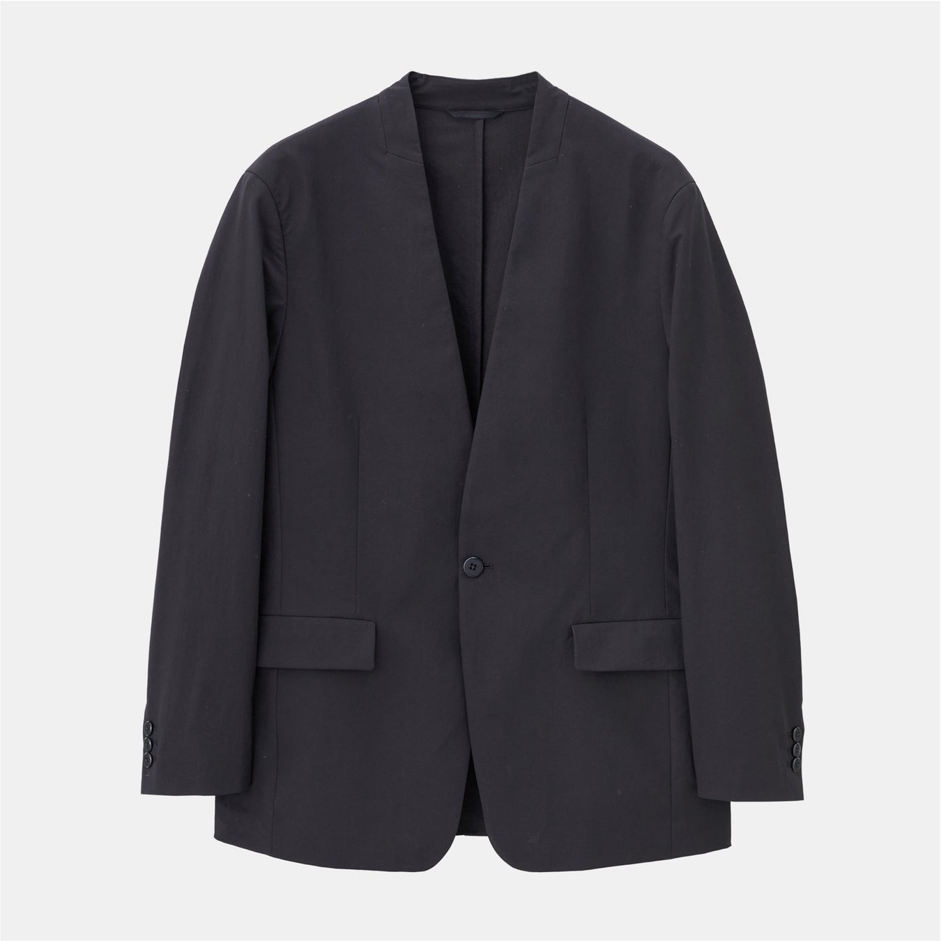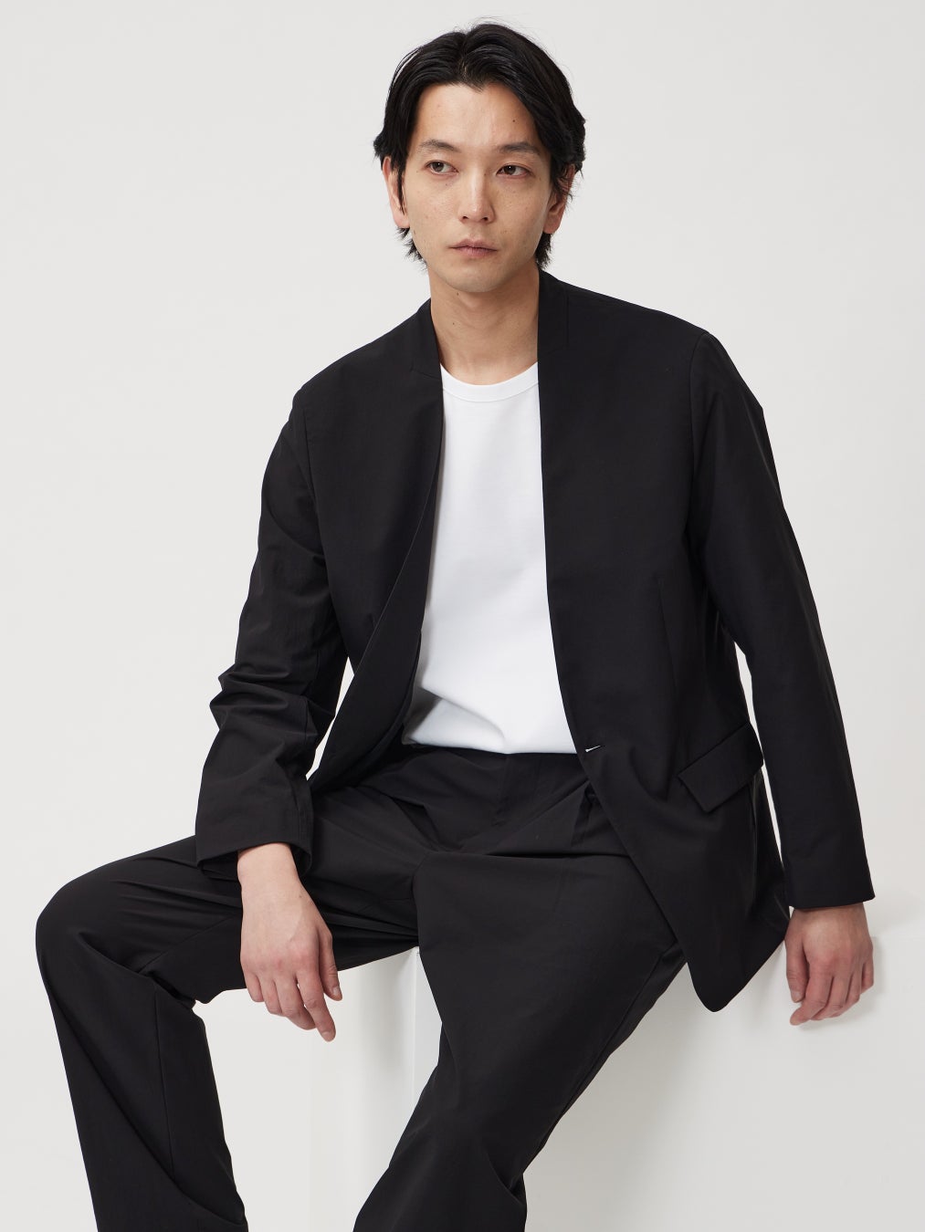 端正ですっきりとした印象の「テックストレッチノーカラージャケット」はテックストレッチシリーズから初めて、スーツスタイルで着用できるジャケットとして登場します。体に程よく馴染むフィット感がありながらも、軽い着心地と高いストレッチ性で快適に着用いただけます。