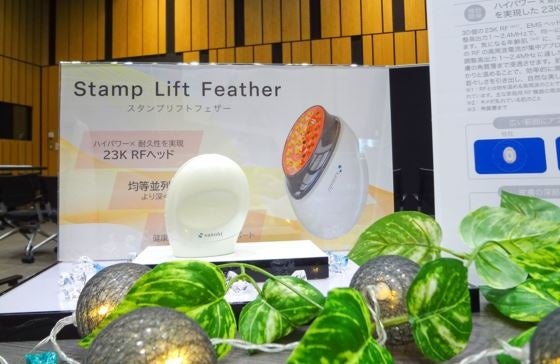 3つの新商品のうち、先行販売がスタートした小型美顔器「スタンプリフトフェザー」は、名前の通りスタンプのように肌へ押し当てることで、効果が得られる注目の商品です。健やかな肌になる秘訣は、赤、青、琥珀の3色による美肌光(LED)による最新のアプローチです。さらに、30個の23金RFヘッドによるエステサロンレベルの高周波によるエステサロンレベルの高周波、AI認知による自動調整出力の高エネルギーで、本来の肌が持つ自然な美しさを引き出します。