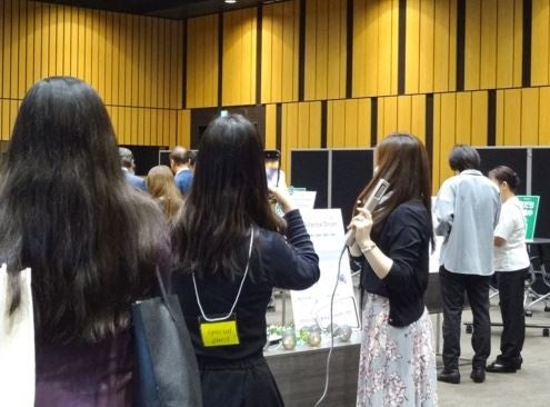 発表会のあとに行われた体験会では、会場を訪れた方々が実際に各商品を手に取って魅力を体感しました。縦型でスタイリッシュなデザインの「アクアサイレンスドライヤー」のブースでは、そのコンパクトな見た目からは想像のつかないパワフルな風量と静音に、多くの方が驚きの声を上げていました。