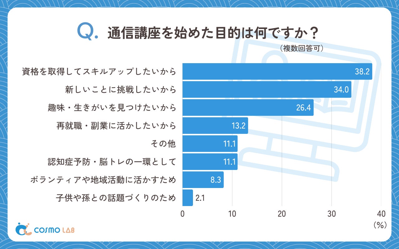 「資格を取得してスキルアップしたいから」(38.2%)が最も多く、「新しいことに挑戦したいから」(34.0%)、「趣味・生きがいを見つけたいから」(26.4%)と続きます。