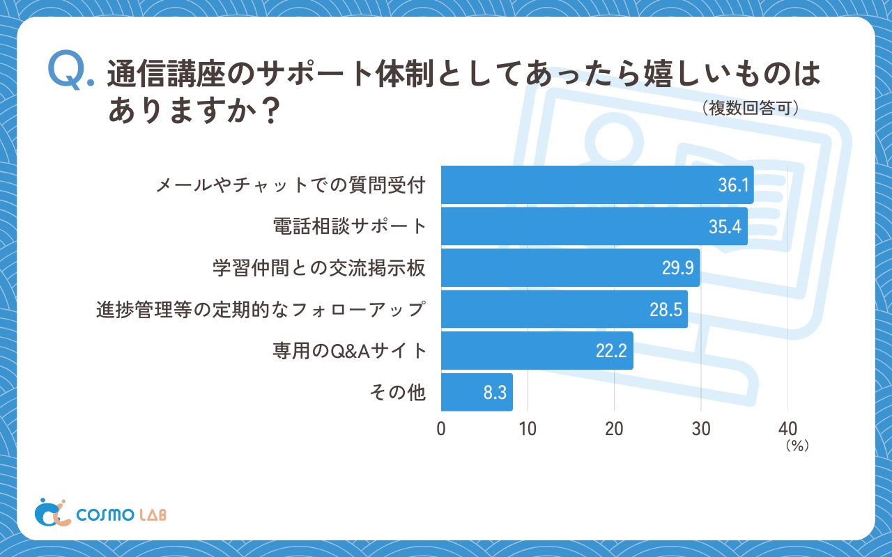 「メールやチャットでの質問受付」(36.1%)、「電話相談サポート」(35.4%)、「学習仲間との交流掲示板」(29.9%)、「進捗管理等の定期的なフォローアップ」(28.5%)と続きます。これらの数字が示すのは、一人で学ぶ不安を解消する人的支援の要望です。