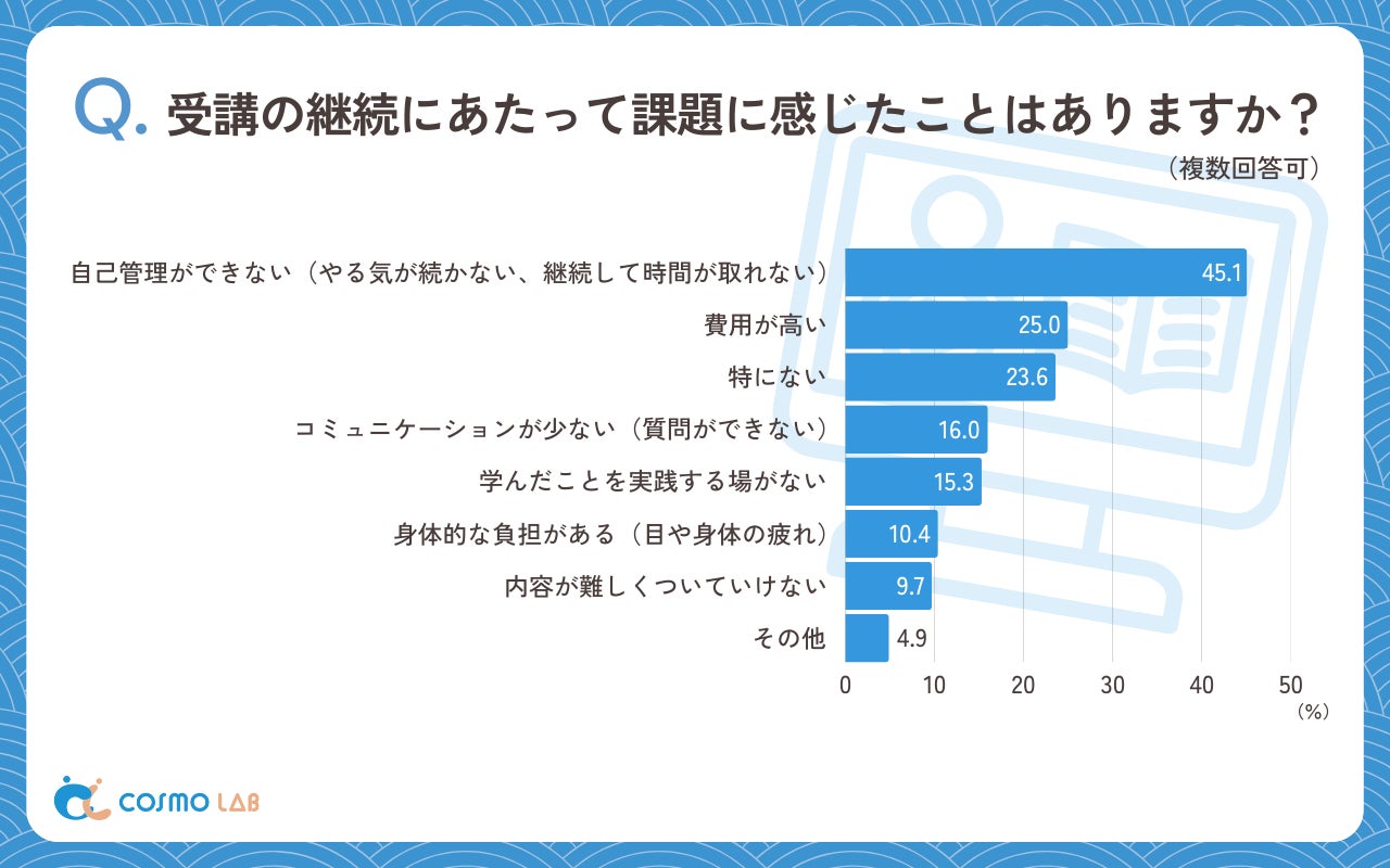 「自己管理ができない(やる気が続かない、継続して時間が取れない)」(45.1%)が最多で、「費用が高い」(25.0%)が続きます。意欲はあっても日常の忙しさやモチベーション維持の難しさが最大のハードルとなっており、一人で学ぶ孤独感も継続を阻む要因と考えられます。