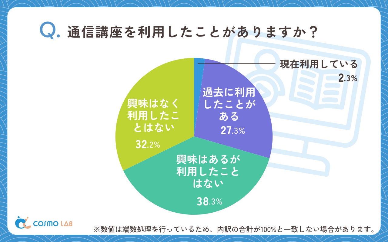 全体の約3割が受講経験者である一方、潜在的関心層が4割に迫る数字は大きな可能性を秘めています。「興味はあるが利用したことはない」(38.3%)が最多となり、「興味はなく利用したことはない」(32.2%)、「過去に利用したことがある」(27.3%)、「現在利用している」(2.3%)と続きます。行動に踏み出せない理由を解消する体験機会の創出と魅力的な情報提供が、この潜在層を動かす鍵となるでしょう。