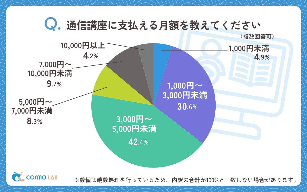 「3,000円〜5,000円未満」(42.4%)が最多で、「1,000円〜3,000円未満」(30.6%)、「7,000円〜10,000円未満」(9.7%)と続きます。実に8割弱の方が月額5,000円未満を適正価格と考えており、この価格帯が継続的な学びを支える経済的な閾値といえます。