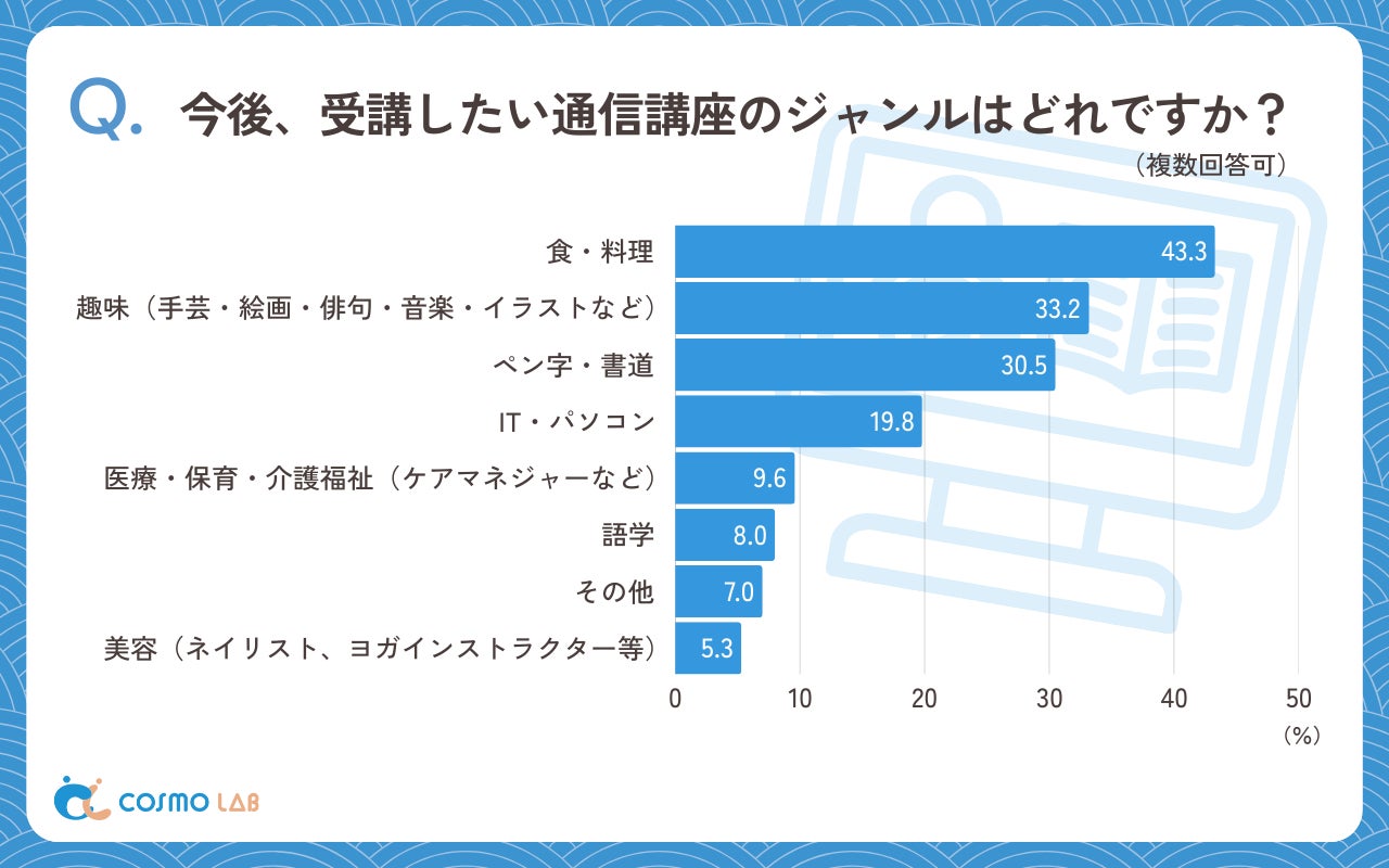 希望する講座ジャンルでは「食・料理」(43.3%)が最多で、「趣味(手芸・絵画・俳句・音楽・イラストなど)」(33.2%)、「ペン字・書道」(30.5%)と続きました。自己表現や感性を磨く学びを通じて、日々の生活に彩りと達成感をもたらす機会を求めています。