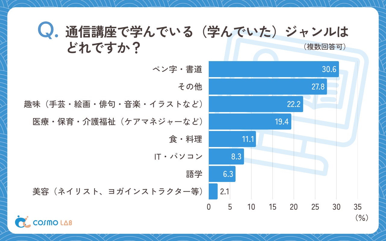「ペン字・書道」(30.6%)が最多で、次いで「趣味(手芸・絵画・俳句・音楽・イラストなど)」(22.2%)、「医療・保育・介護福祉(ケアマネジャーなど)」(19.4%)と続きます。自己表現と感性を磨く分野と、実生活で活かせる専門スキルの両方に高い関心が向けられています。