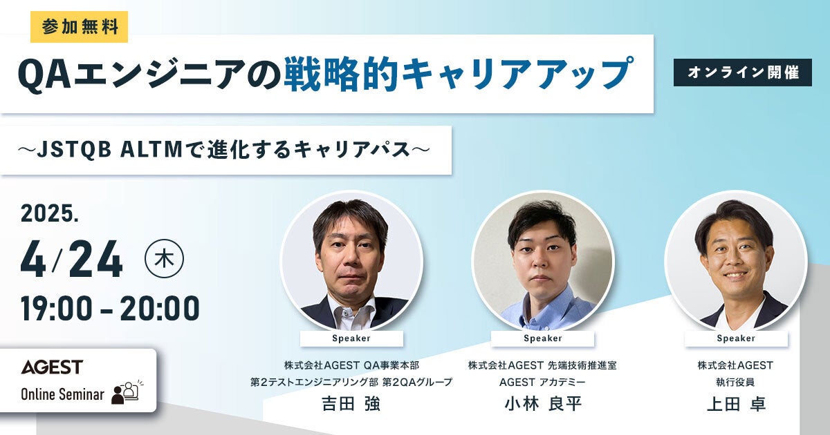 先端品質テクノロジーを活用してソフトウェアの品質・安全性向上を支援する株式会社AGEST(本社: 東京都文京区、代表取締役 社長執行役員 CEO: 二宮 康真、以下、「AGEST」)は、2025年4月24日(木)にQAエンジニア向けセミナー『QAエンジニアの戦略的キャリアアップ~JSTQB ALTMで進化するキャリアパス~』を開催することをお知らせいたします。
