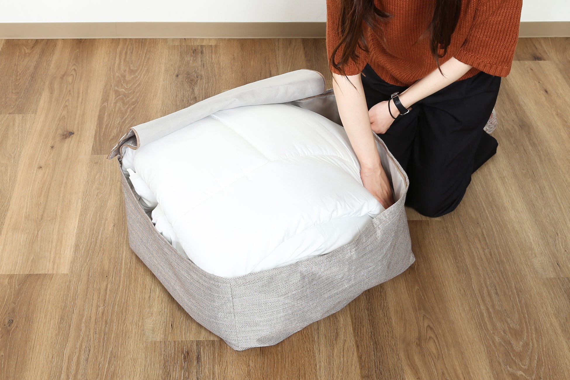 このクッションカバーはオフシーズンの羽毛布団や来客用の布団など、収納場所を圧迫するものを詰めてリビングなどで見せ置きできるクッションに変えるアイテムです。カバーに詰めるだけなので簡単に使用でき、負担のかかる押し入れへの出し入れも不要になるためシニア世代にもおすすめです。
