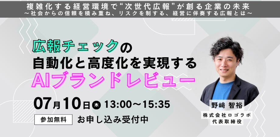 ロゴラボ、PR広報向け大型カンファレンス「複雑化する経営環境で“次世代広報”が創る企業の未来」にCEO野﨑が登壇 〜 広報チェックの自動化と精度向上を実現する「AIブランドレビュー」を解説 〜