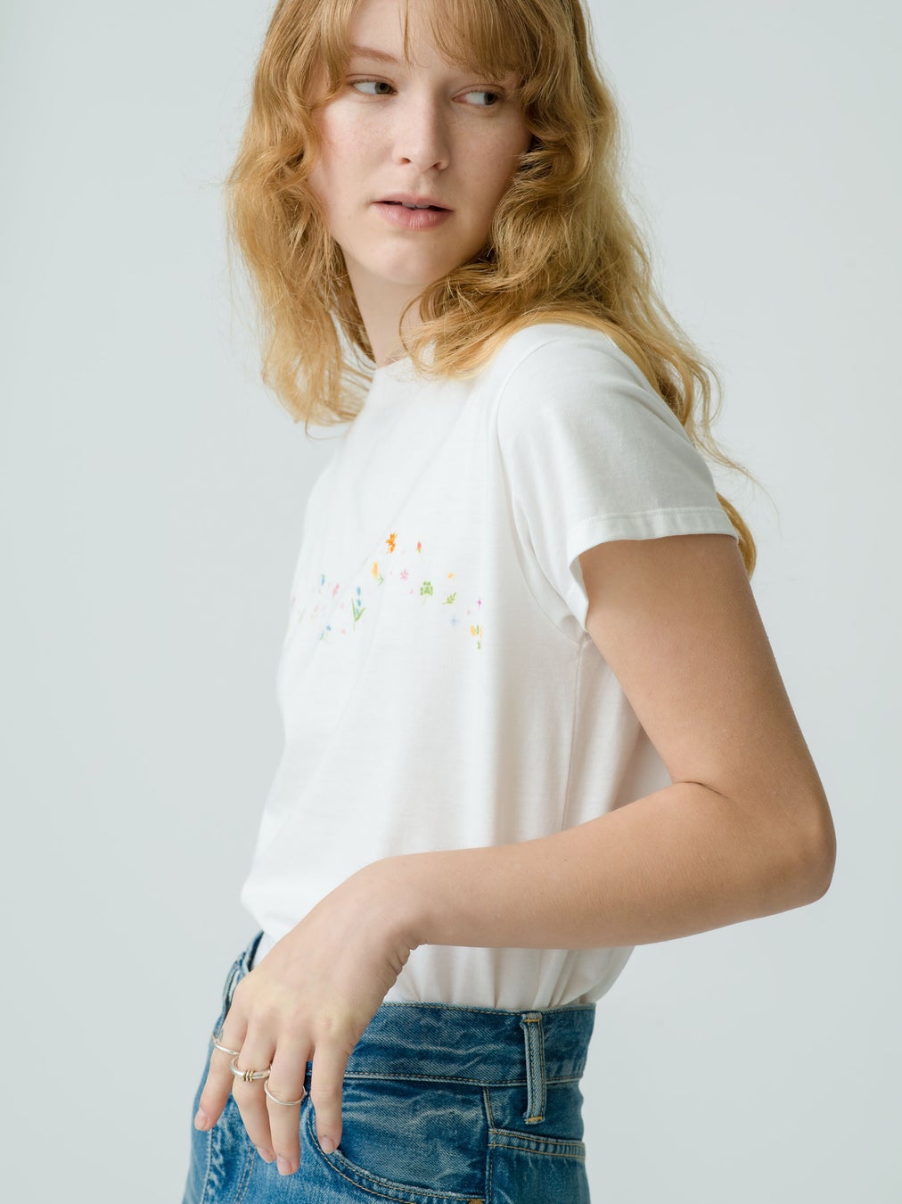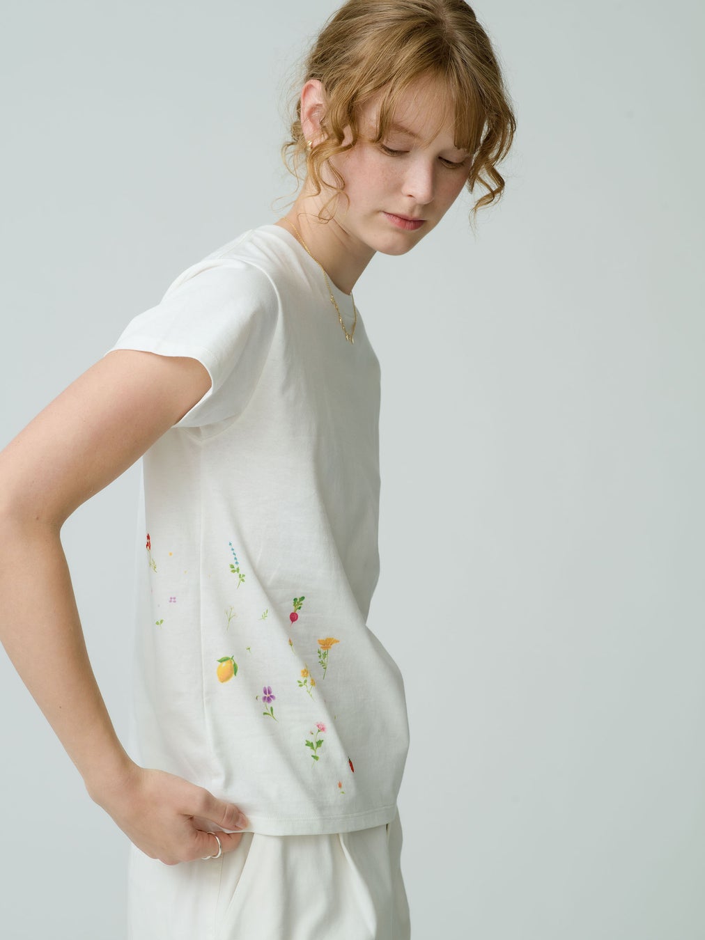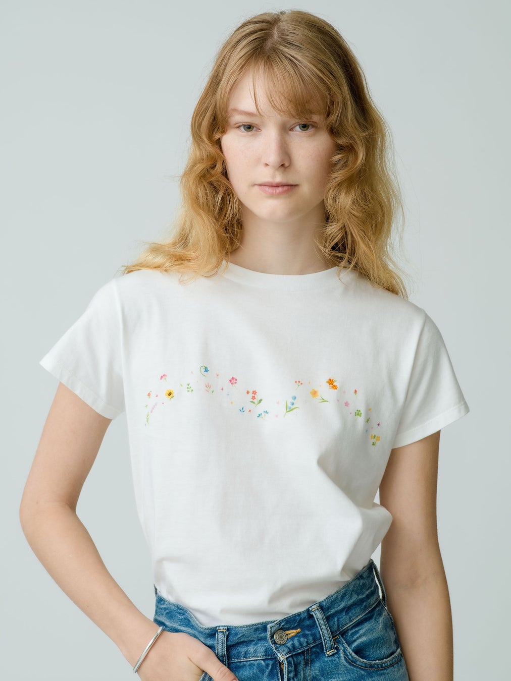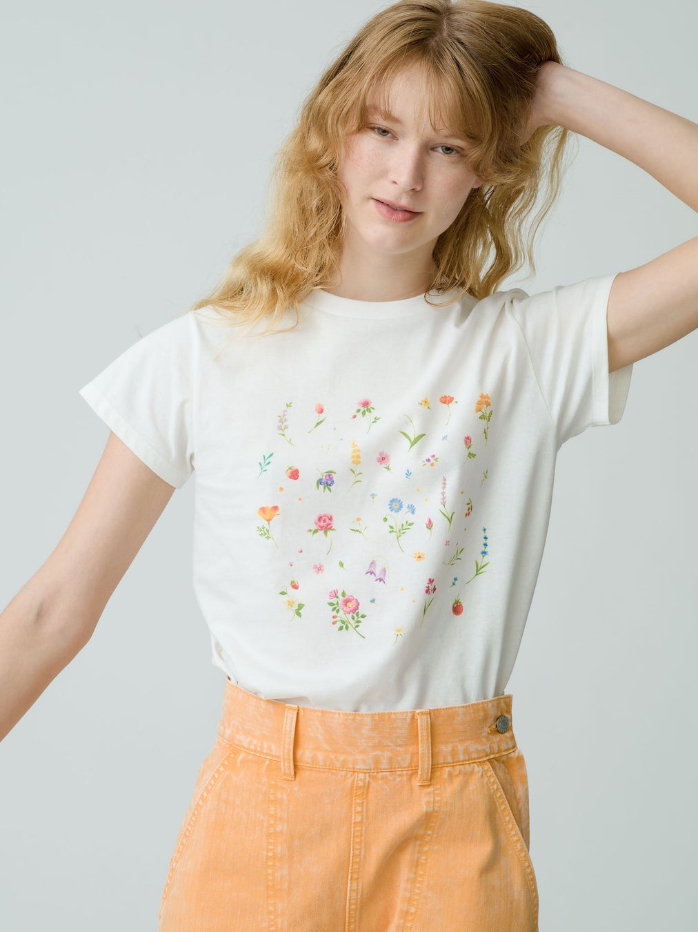 彼女の豊かで優しい感性がギュッと詰まったTシャツは、ロマンチックに広がるスカートやキャミソールワンピースの下に重ね、さりげなく覗くアートを楽しんだり、ハイライズのデニムにインしてクールに。また、色彩をさらに楽しむカラーボトムス等、心がナチュラルでいられるあなたらしいコーディネートでお楽しみください。