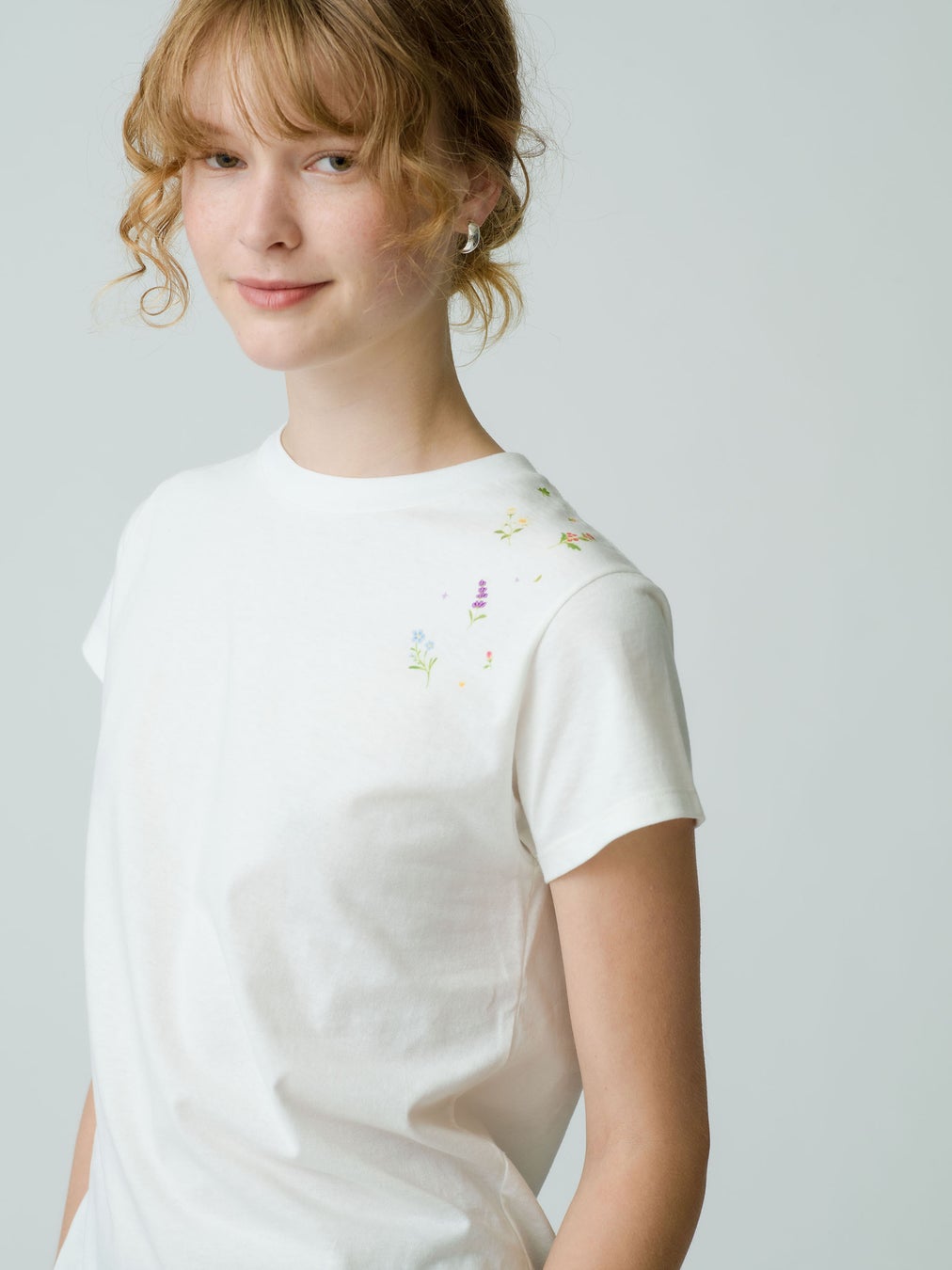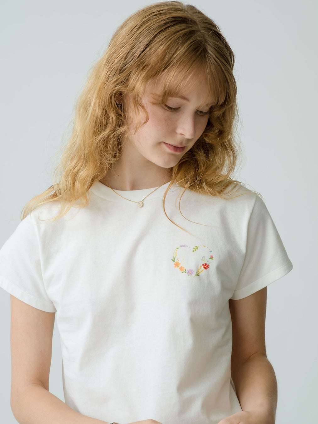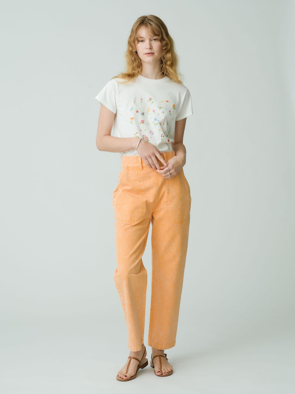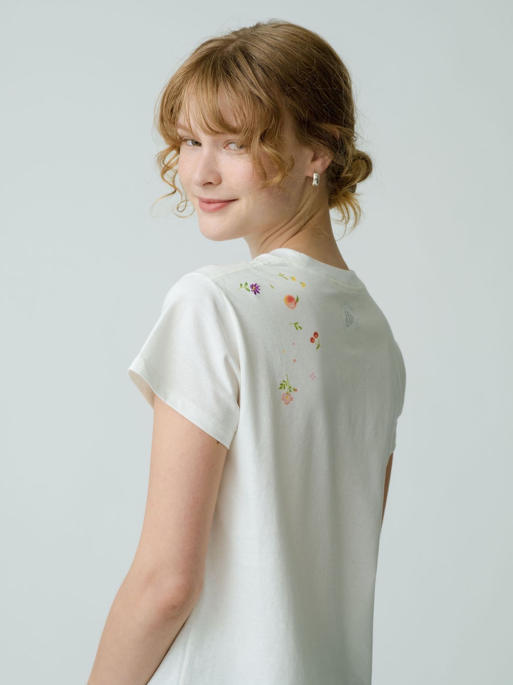 彼女の豊かで優しい感性がギュッと詰まったTシャツは、ロマンチックに広がるスカートやキャミソールワンピースの下に重ね、さりげなく覗くアートを楽しんだり、ハイライズのデニムにインしてクールに。また、色彩をさらに楽しむカラーボトムス等、心がナチュラルでいられるあなたらしいコーディネートでお楽しみください。