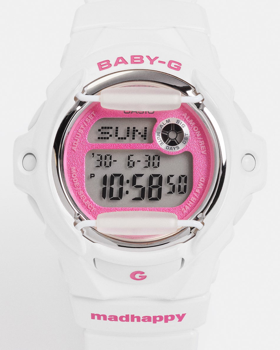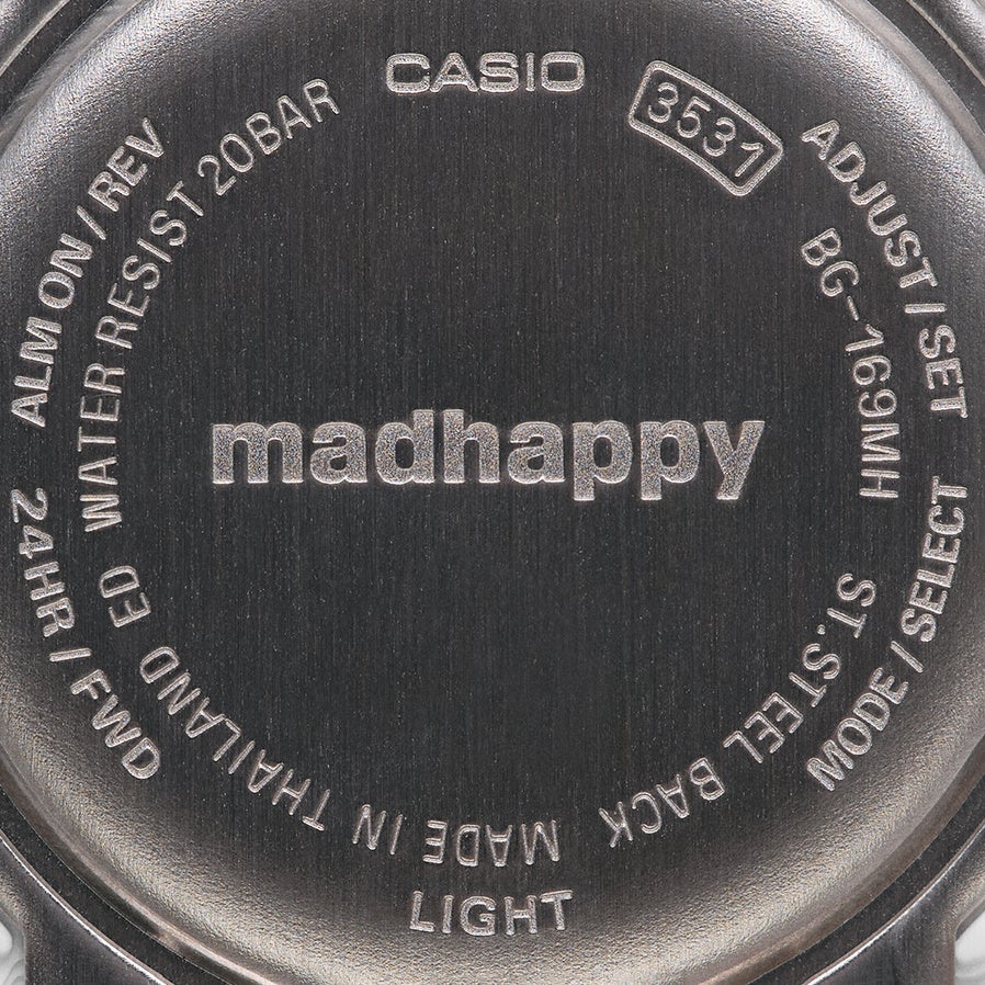 本作は、レトロフューチャーなデザインで知られる「BG-169」をベースにした特別仕様モデル。BABY-Gが誇るタフネスと自己表現の精神を軸に、Madhappyの“楽観主義”という視点で再解釈し、ノスタルジーと前進するエネルギーの融合を表現しています。