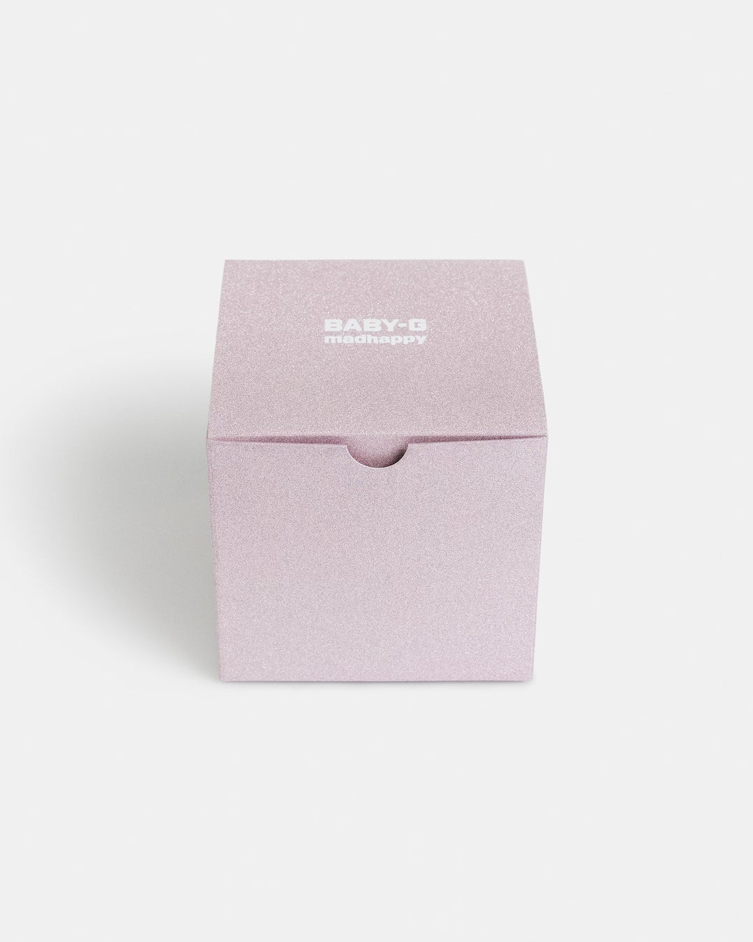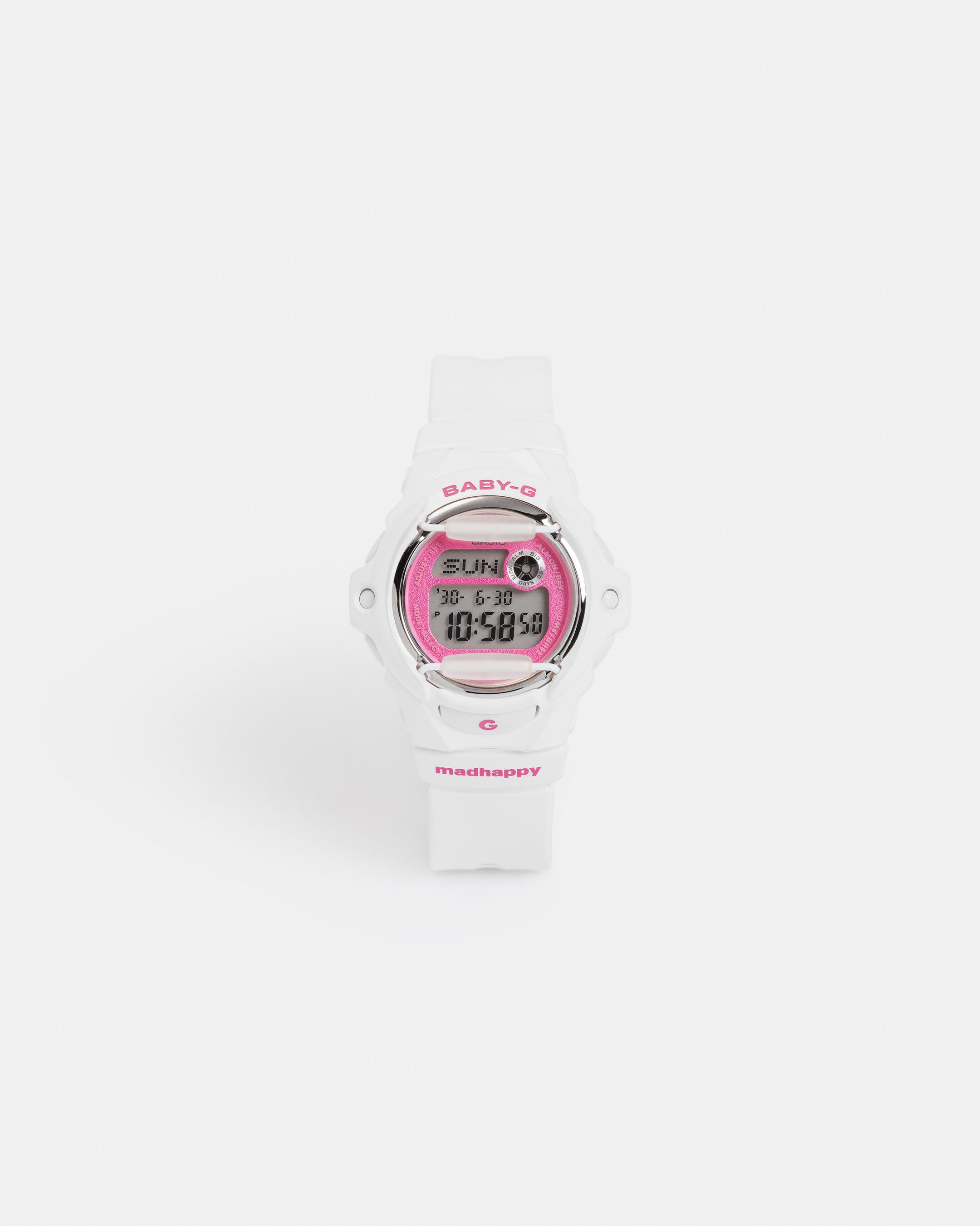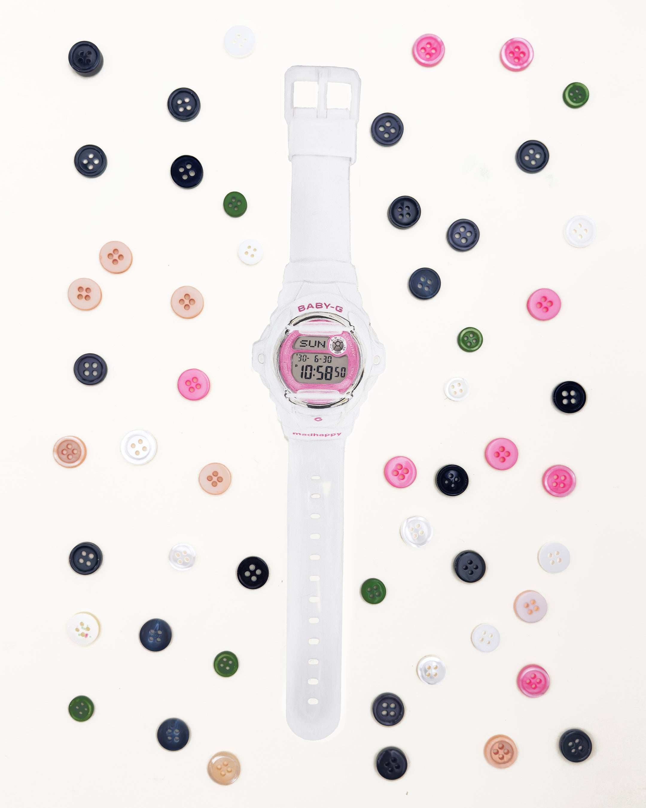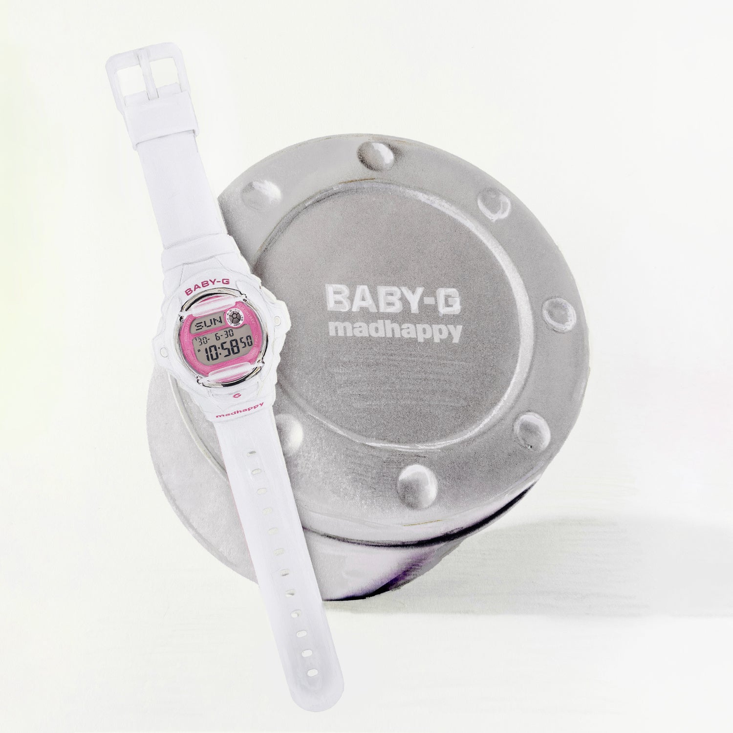 やわらかなピンクの文字盤と、クリーンなホワイトのケース&バンドのコントラストが、明るく軽やかな印象を演出。裏蓋にはMadhappyのロゴを刻印し、LEDバックライトを点灯させると、LCDディスプレイ上にMadhappyロゴのシルエットが浮かび上がる特別仕様となっています。さらに、本コラボレーション限定のカスタム・コーブランディングパッケージが付属します。