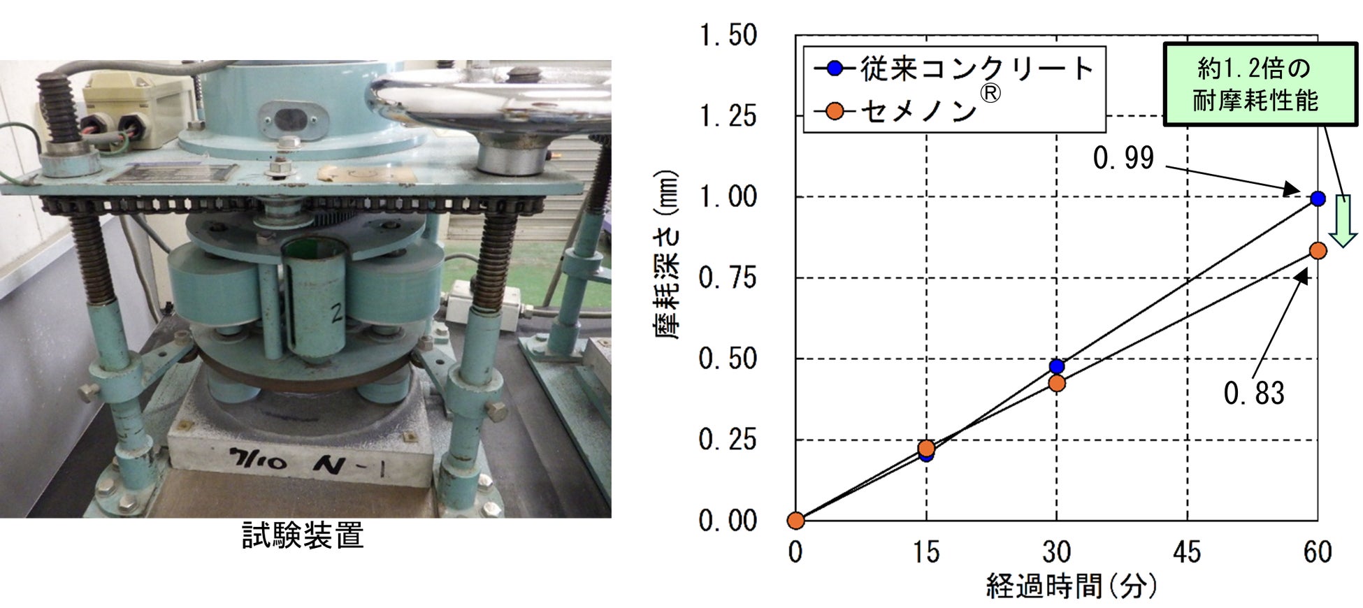 本試験は、ASTM C779–05「Standard Test Method for Abrasion Resistance of Horizontal Concrete Surfaces(水平なコンクリート表面の耐摩性耗試験、A法:回転円盤機)」に準拠し、経過時間60分後の摩耗深さを測定しました。その結果、セメノンⓇは従来コンクリートと比較して約1.2倍の耐摩耗性を有していることが明らかとなりました。(図2)