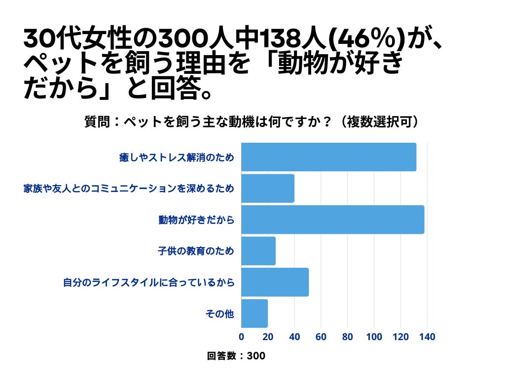 30代女性の300人中138人(46%)が、 ペットを飼う理由を「動物が好き だから」と回答【ペットに関するアンケート】